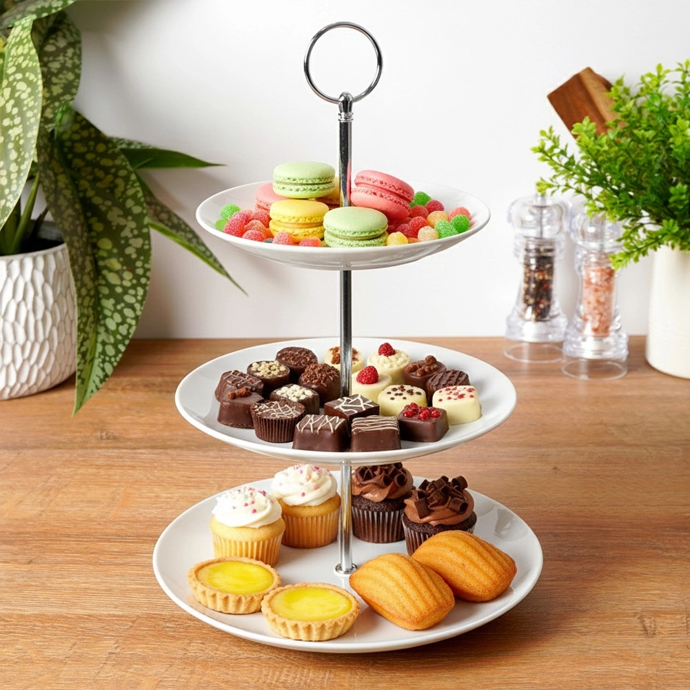 Drie ronde borden met een diameter van circa 25, 20 en 15 cm bieden volop ruimte voor desserts, fruit en hapjes, terwijl ze tegelijkertijd tafelruimte besparen.
