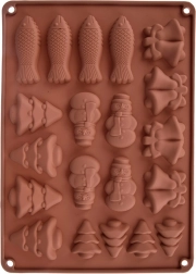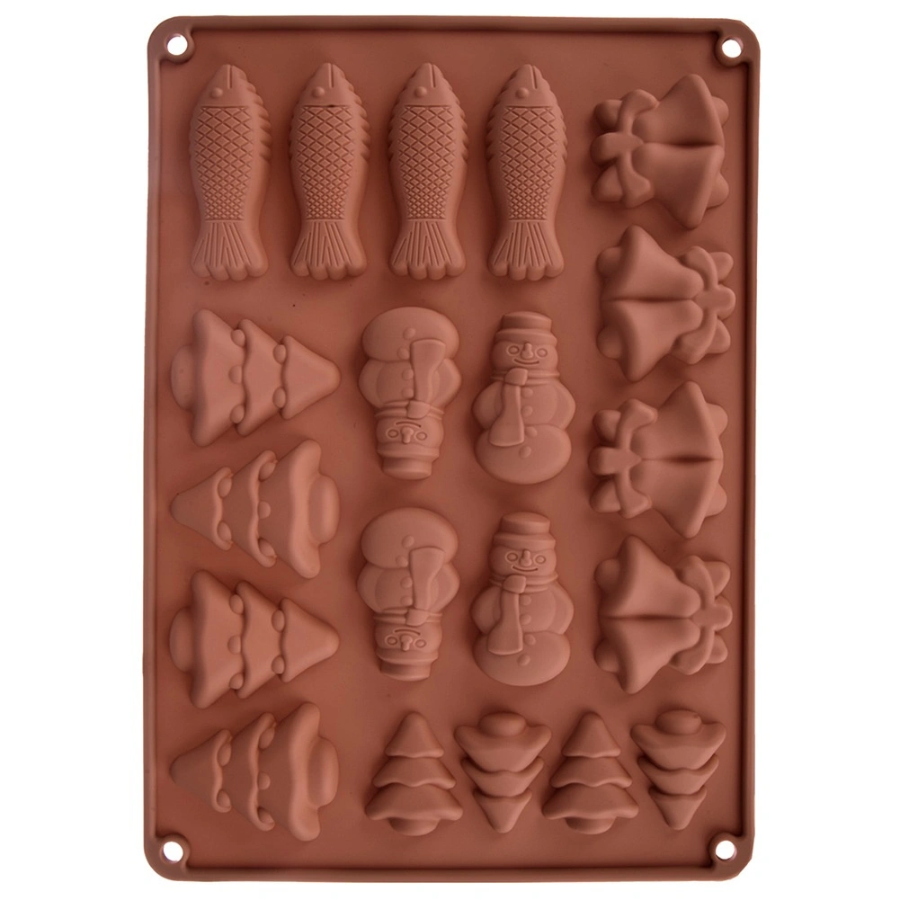 Praktische siliconen vorm voor eenvoudig bakken en gieten van chocolade in winterse motieven. Dankzij 20 holtes maak je in één keer zoetigheden in vijf vormen – boompje, sneeuwpop, bel en vis. Het materiaal is antiaanbak, flexibel en temperatuurbestendig van -40 tot +200 °C, geschikt voor de oven, magnetron en vriezer, en is vaatwasserbestendig.