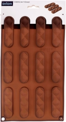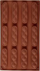 De vorm heeft twaalf langwerpige holtes met een decoratief patroon, waarmee je in één batch uniforme en esthetische koekjes of pralines maakt.