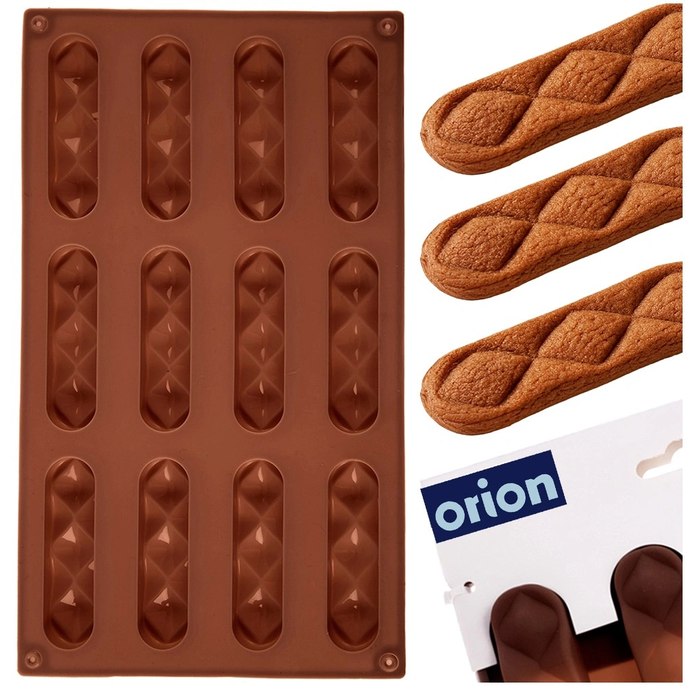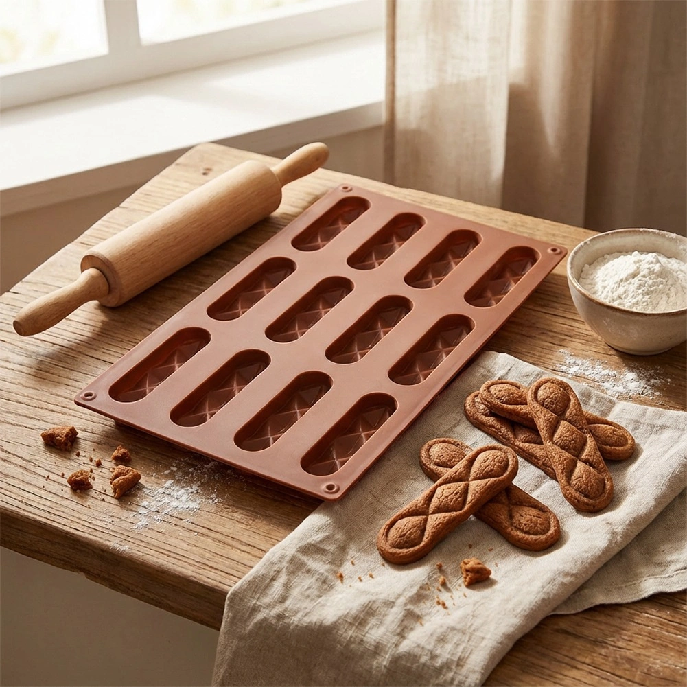 Met deze hoogwaardige siliconen vorm maak je brosse koekjes en zelfgemaakte pralines in een elegante langwerpige vorm. Eén batch levert 12 stuks van circa 8 × 2 × 1 cm, die dankzij het antiaanbakoppervlak gemakkelijk uit de vorm komen zonder te breken. De vorm zorgt voor egale garing en een prachtig decor met diamantpatroon.