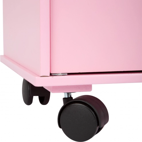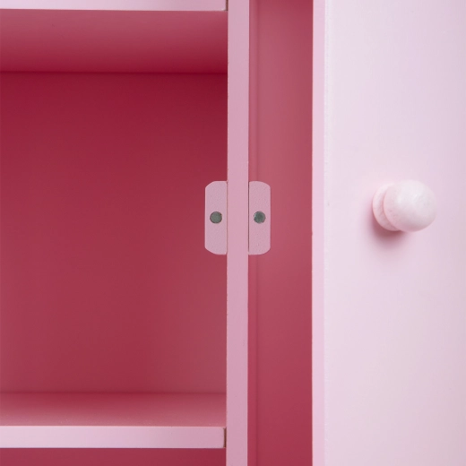 Stijlvolle roze kast voor poppen van SMALL FOOT met veel opbergruimte, een hangerstang en planken. Dankzij de wieltjes kunnen kinderen haar eenvoudig verplaatsen, terwijl de magnetische sluiting en... Meer tonen