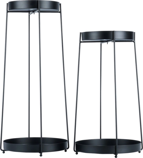 De set bevat twee standaards met hoogtes van 46 en 58 cm met uitneembare schalen voor eenvoudig reinigen en verplaatsen van planten. Dankzij de stabiele metalen constructie dragen ze veilig de meeste gangbare bloempotten en zijn ze ook geschikt voor decoraties en kleine accessoires.