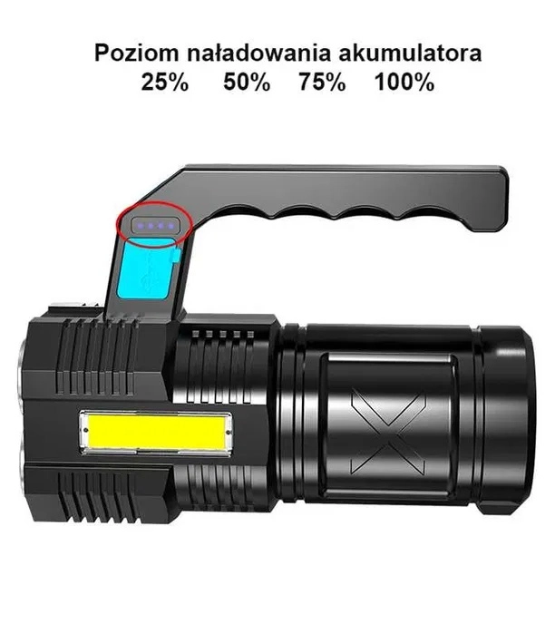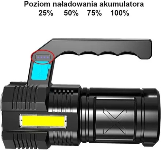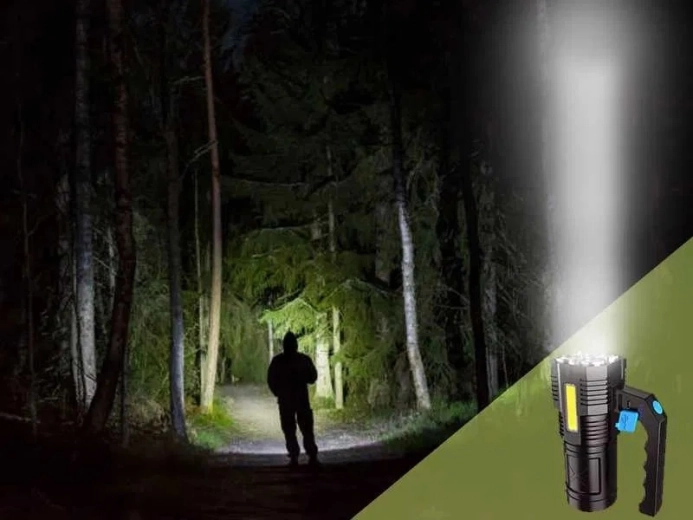 Deze robuuste, waterdichte LED-zaklamp combineert een krachtige hoofdbundel met vier T6-LED’s en praktisch zijwaarts COB-werklicht voor diffuse verlichting zonder verblinding. Opladen gaat gemakkelijk via USB en de hoogwaardige 18650-accu levert betrouwbare prestaties thuis, in de auto en bij outdooractiviteiten.