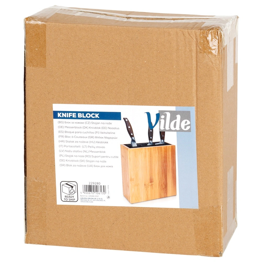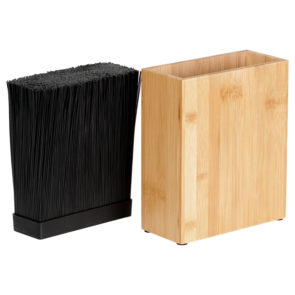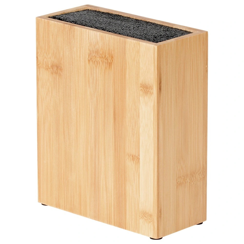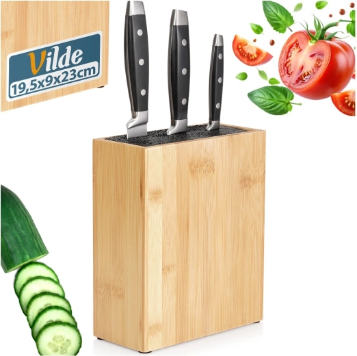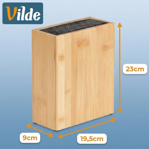 Universeel bamboe messenblok met afmetingen 19,5 × 9 × 23 cm voor veilig en overzichtelijk opbergen van keukenmessen en -hulpmiddelen. Dankzij de uitneembare kunststof borstelinzet geschikt voor messen van verschillende maten en vormen zonder het lemmet te beschadigen. Duurzaam bamboe geeft de keuken natuurlijke elegantie en antislip viltpads zorgen voor stabiliteit op het aanrecht.