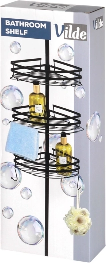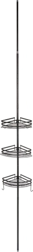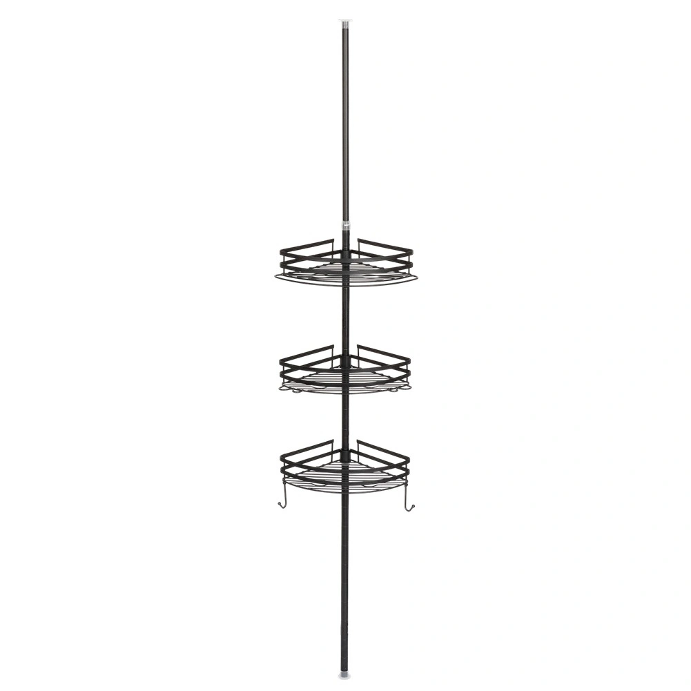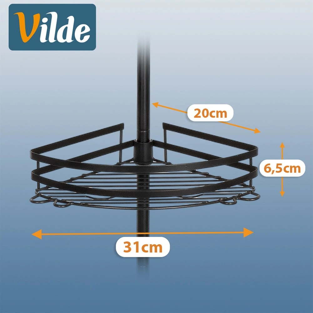 Praktische hoekdoucheplank met een telescopische klemstang zonder boren en 3 ruime mandjes voor shampoos en cosmetica. Duurzame volledig metalen constructie in matzwart, verstelbare hoogte en snelle waterafvoer dankzij de draadbodem zorgen voor orde en droogte in de douche en boven het bad.