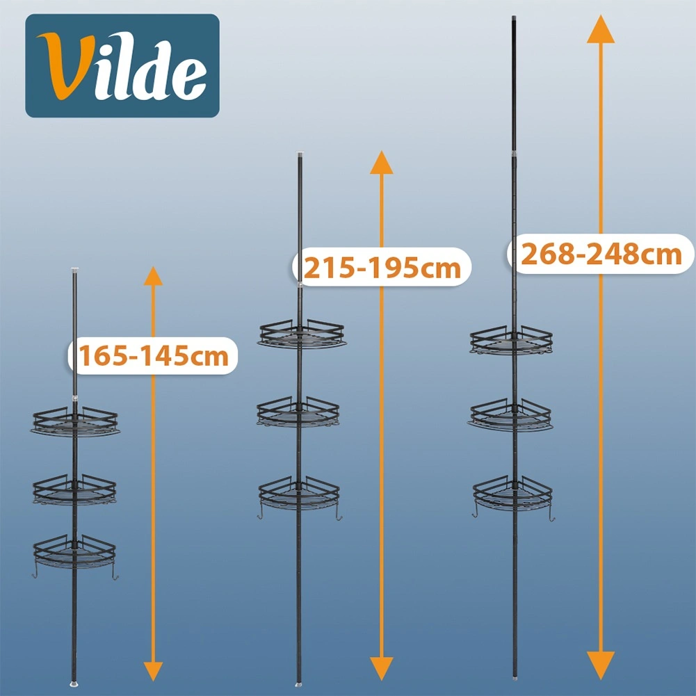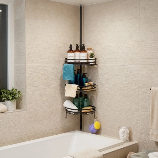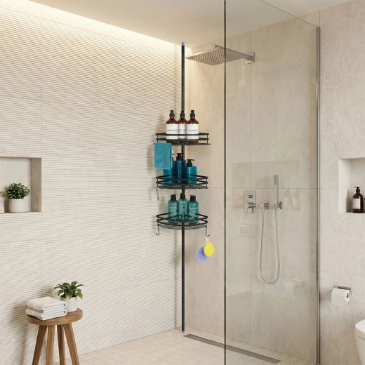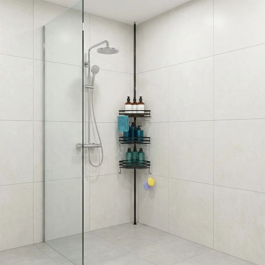 Richt je badkamer stijlvol en functioneel in. Deze hoekdoucheplank met telescoopstang wordt gemonteerd zonder boren – je klemt hem eenvoudig tussen vloer en plafond. De verstelbare hoogte laat je de positie van de planken exact afstemmen op je douche of badkamer, terwijl de matzwarte metalen afwerking een moderne look en lange levensduur biedt.