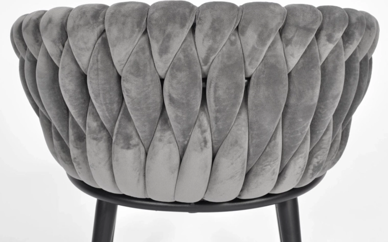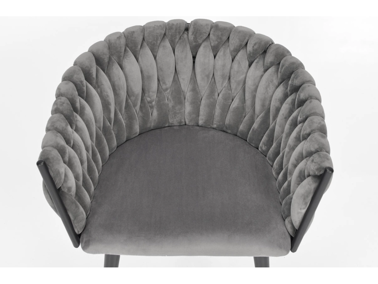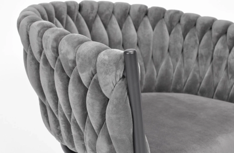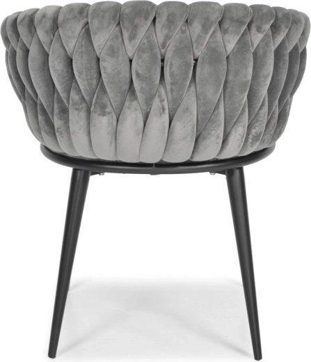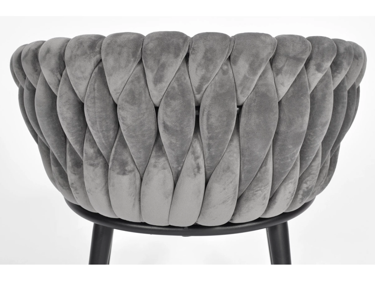 Breng elegantie en comfort in huis in moderne glamourstijl. De fluwelen bekleding met subtiele glans oogt luxueus en vormt een prachtig contrast met de zwarte, slanke metalen poten. De opvallende gevlochten rugleuning is een decoratief element dat direct in het oog springt en de stoel tot een designstatement in de ruimte maakt.