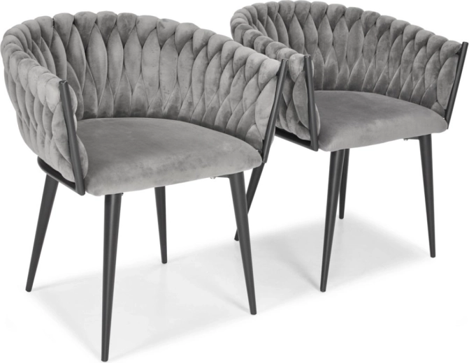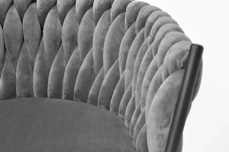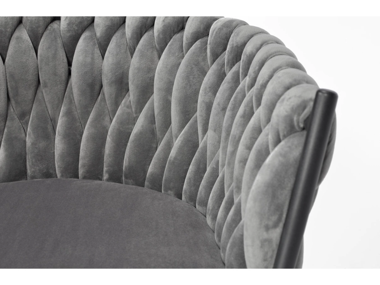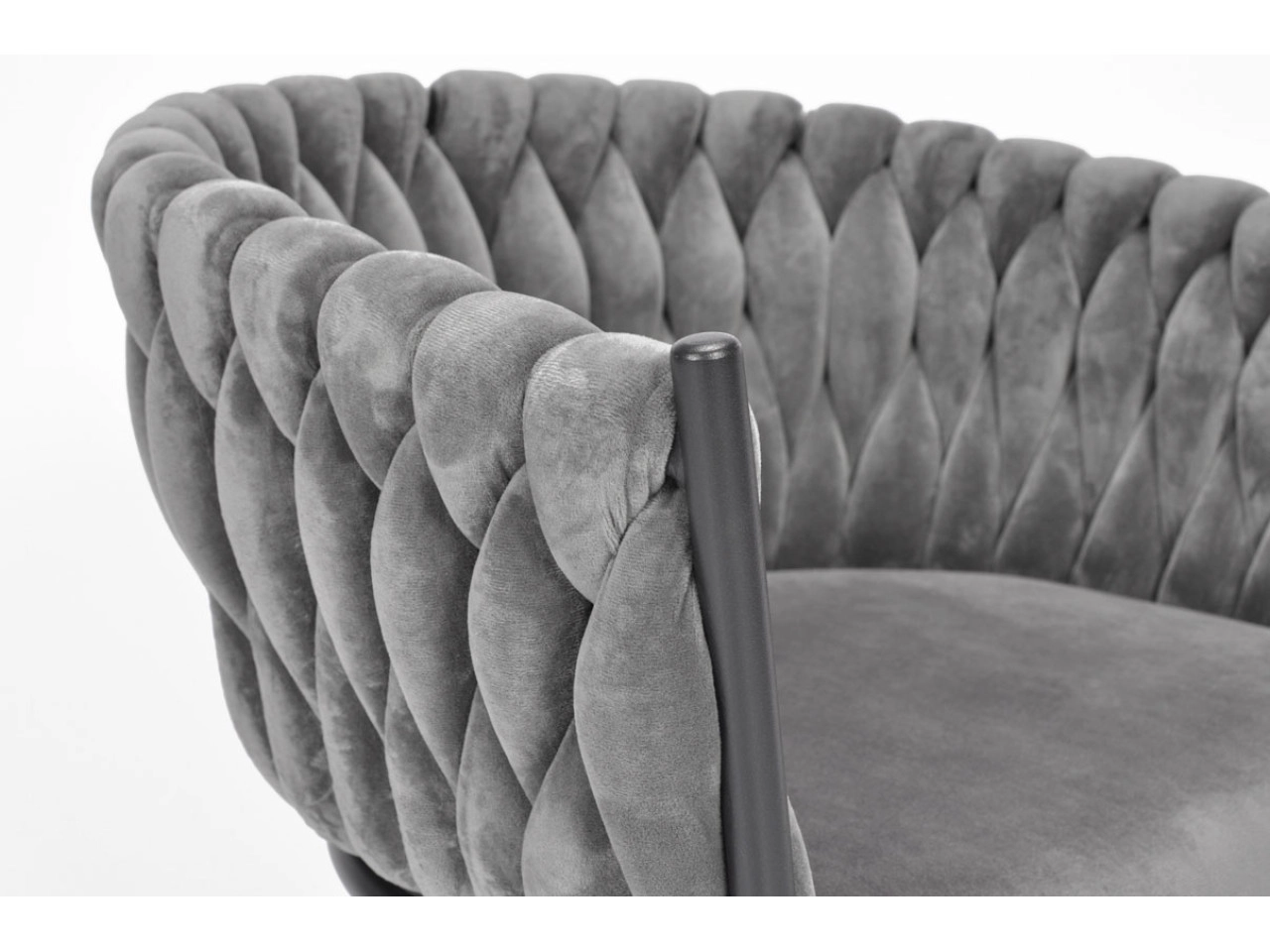 Breng elegantie en comfort in huis in moderne glamourstijl. De fluwelen bekleding met subtiele glans oogt luxueus en vormt een prachtig contrast met de zwarte, slanke metalen poten. De opvallende gevlochten rugleuning is een decoratief element dat direct in het oog springt en de stoel tot een designstatement in de ruimte maakt.