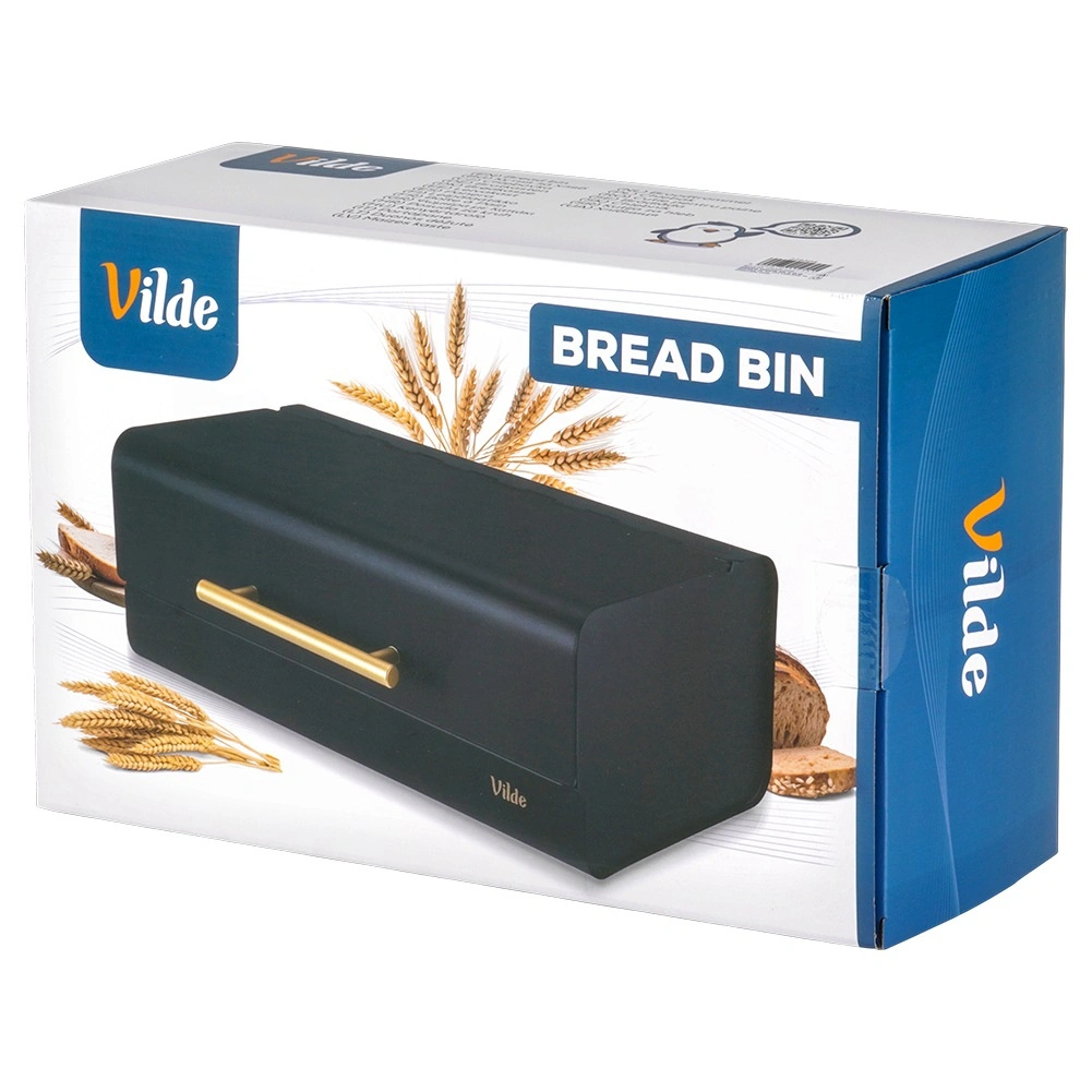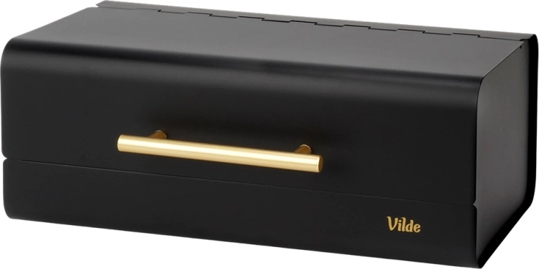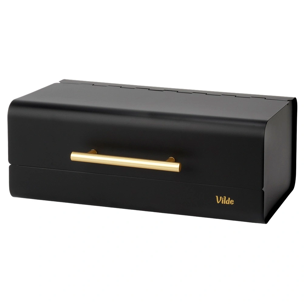 Een elegante metalen broodtrommel in matzwart houdt jouw brood en banket langer vers. Hij heeft een stevige metalen constructie, comfortabele opening met een gouden handgreep en antislip voetjes voor stabiliteit op het aanrecht. Een stijlvolle toevoeging aan elke moderne keuken.