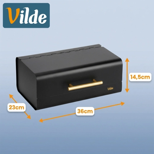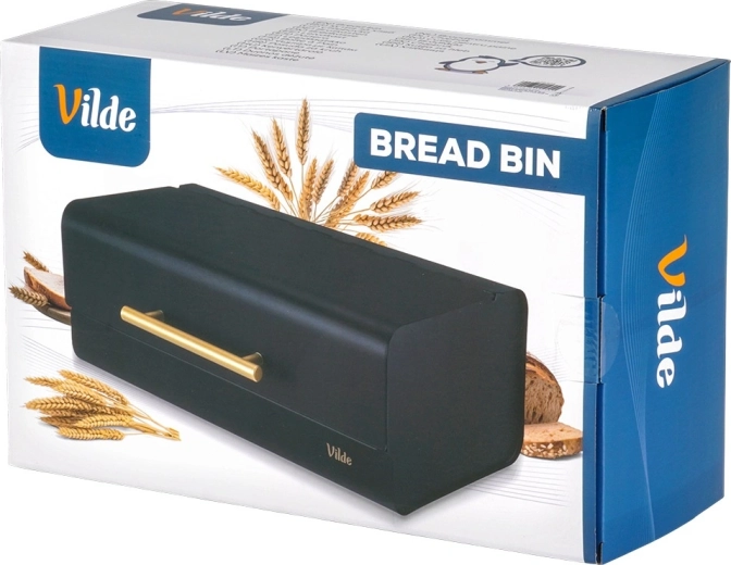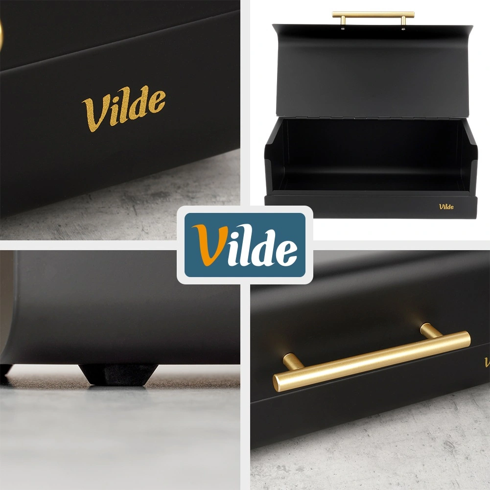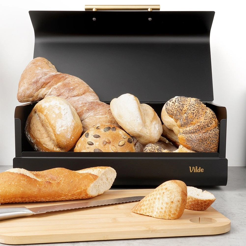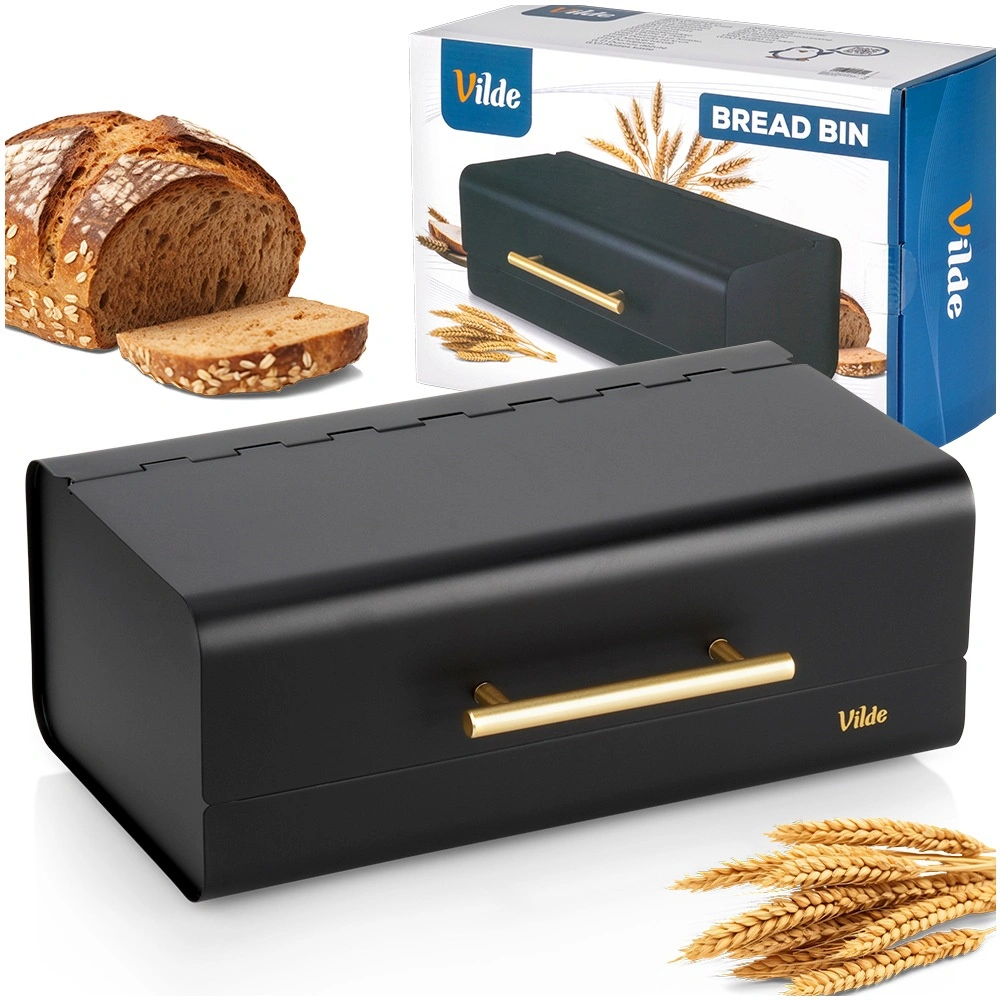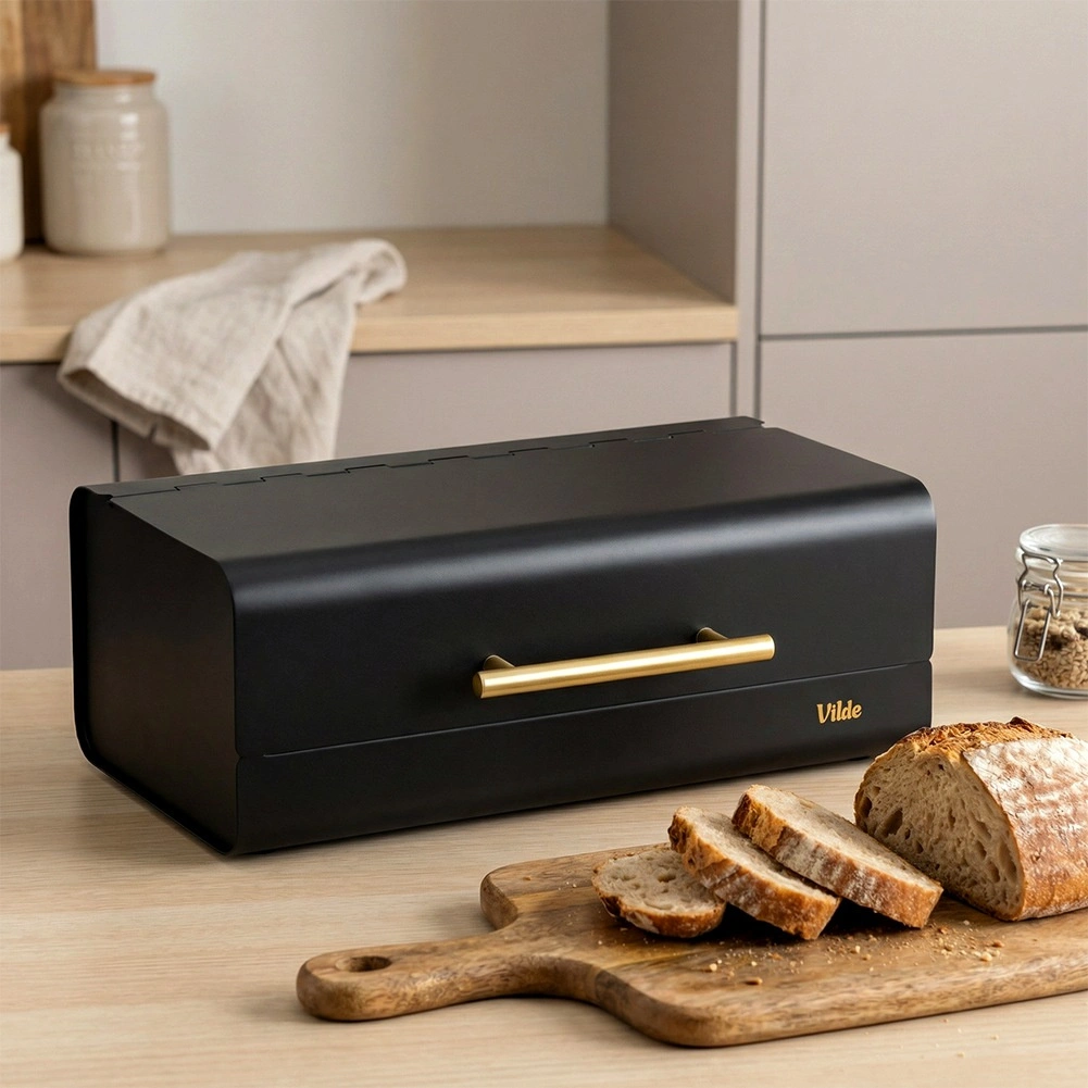 Een stijlvolle en praktische broodtrommel van duurzaam metaal beschermt brood tegen luchttoetreding, uitdroging en indeuken. Dankzij de compacte afmetingen van 36 × 23 × 14,5 cm past hij gemakkelijk op het aanrecht, terwijl hij toch ruim genoeg is voor brood, broodjes en baguettes. De matzwarte afwerking en de elegante gouden handgreep benadrukken de moderne look die eenvoudig te combineren is met de rest van je keukenuitrusting.