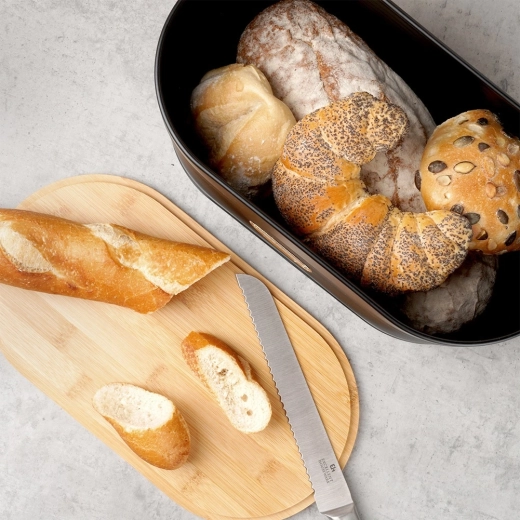 De ovale broodtrommel beperkt de luchttoevoer en beschermt gebak tegen uitdroging. Ideale afmetingen 34 × 18,5 × 15 cm voor de dagelijkse voorraad.