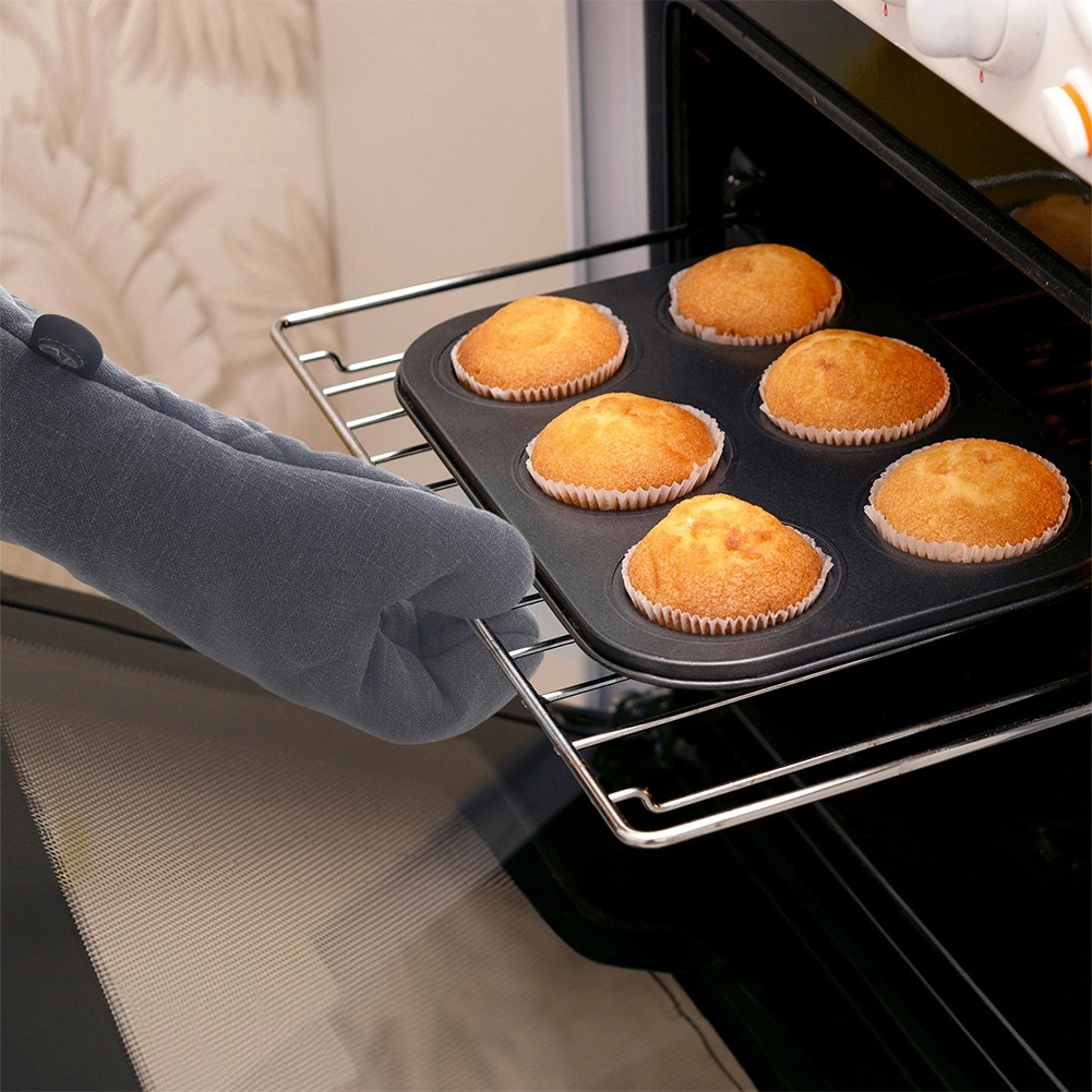 Deze duurzame ovenwant van 100% katoen is ontworpen voor dagelijks gebruik. Dankzij de dikke voering en het verlengde polsgedeelte draag je veilig hete braadsledes, pannen en bakvormen uit de oven. De universele maat 17,5 × 32 cm past aan zowel de rechter- als de linkerhand en sluit goed aan op de handpalm.