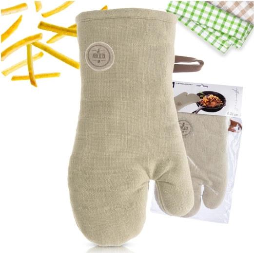 Praktische keukenovenwant van 100% katoen in olijfgroene kleur zorgt voor betrouwbare bescherming tegen hitte bij koken en bakken. Dankzij de ingebouwde magneet en het ophanglusje berg je haar gemakkelijk op aan de koelkast of oven. De universele maat 17,5 × 32 cm past aan zowel de rechter- als de linkerhand en zorgt voor een comfortabele greep op hete pannen en schalen.