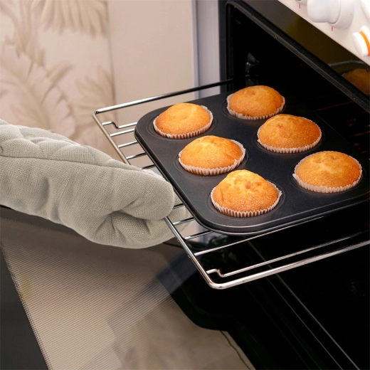 De voering en doorgestikte constructie beschermen de hand tegen hitte en zorgen voor een zekere grip op bakplaten en pannen.