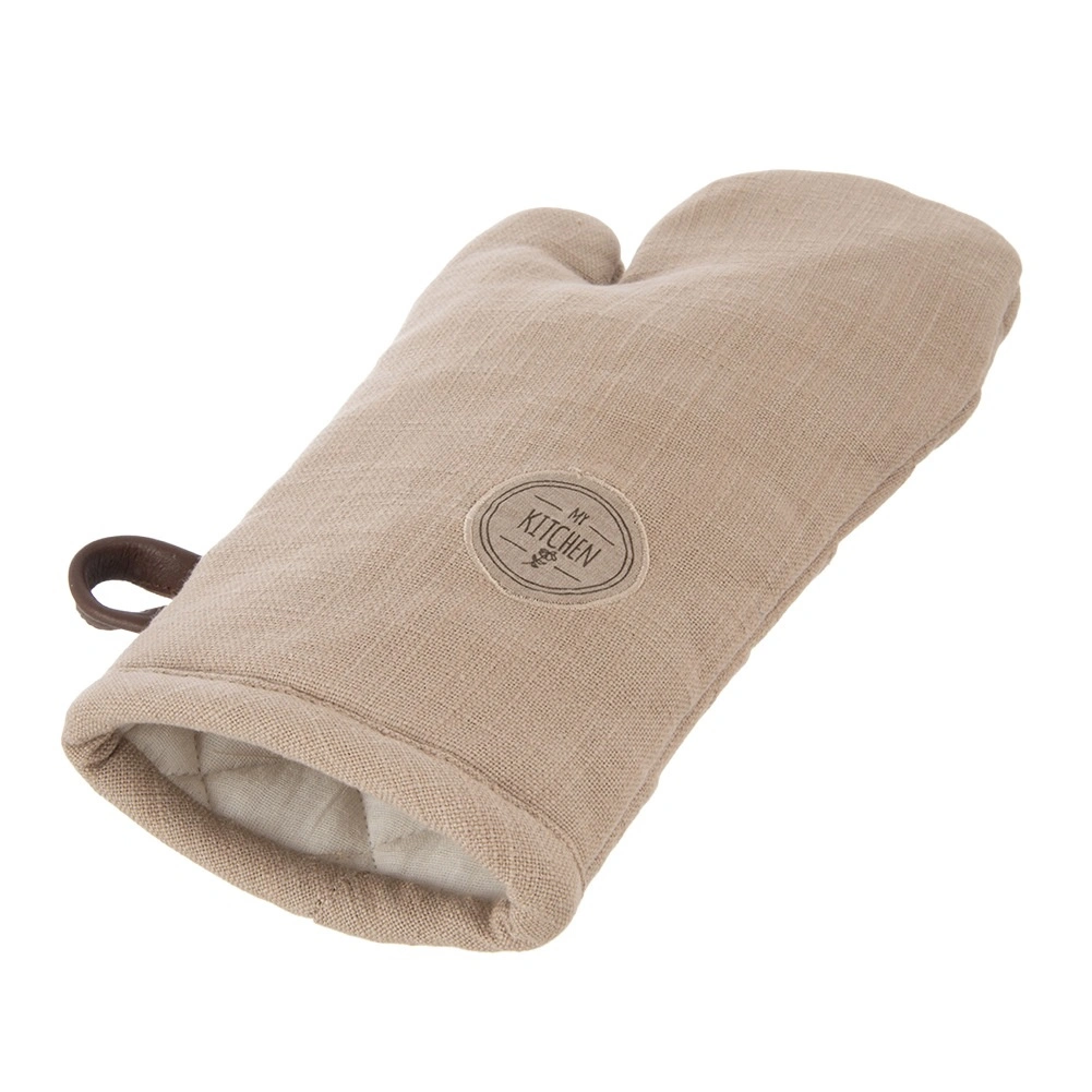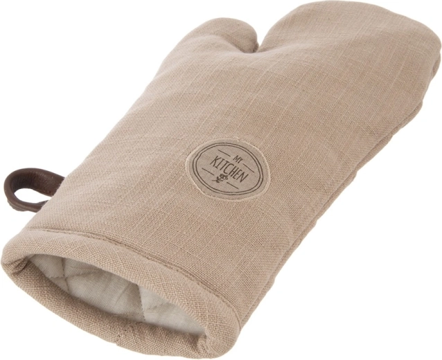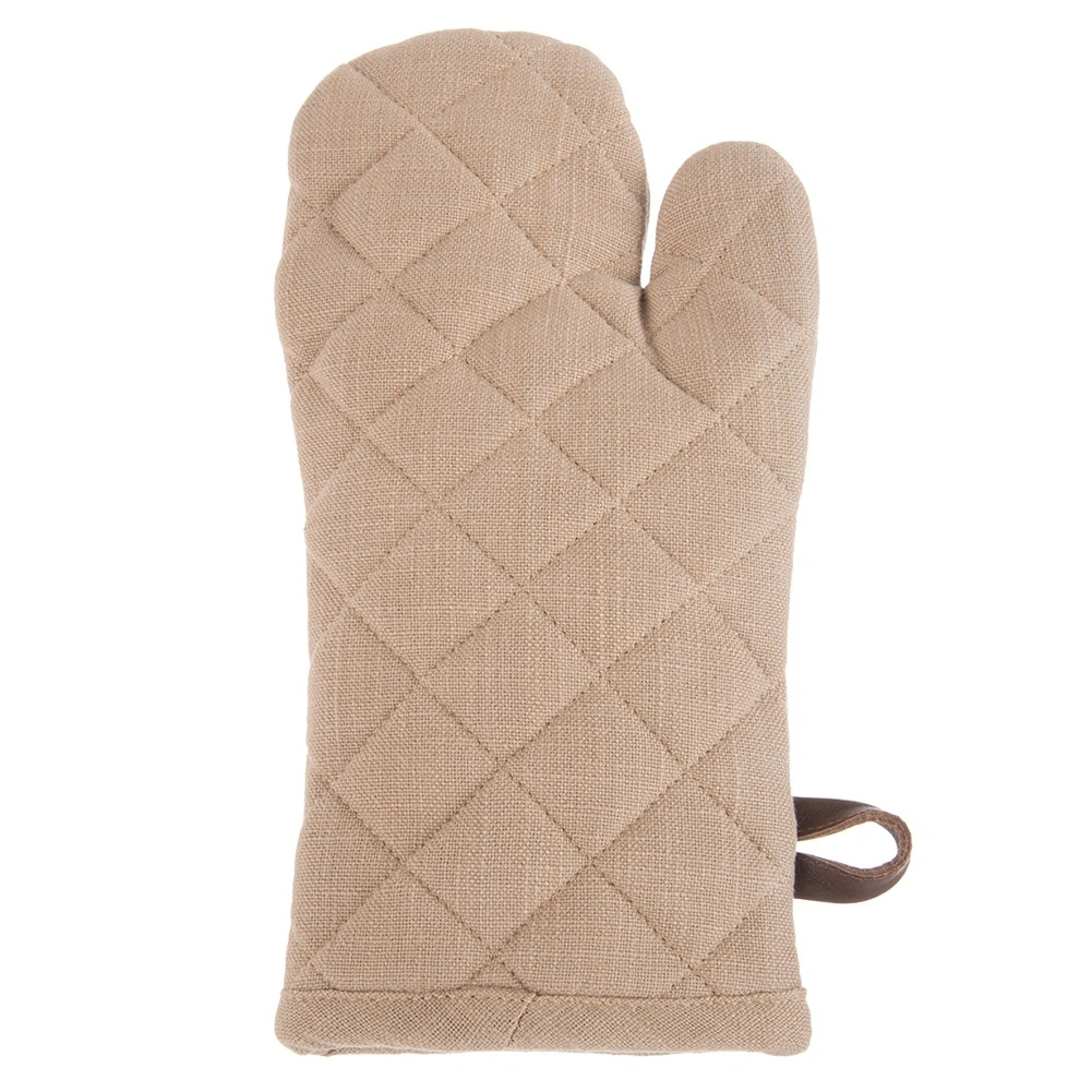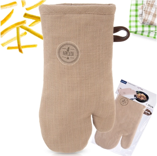 Deze bruine katoenen ovenwant (17,5 × 32 cm) is ontworpen voor veilig hanteren van hete bakplaten en kookgerei. De universele pasvorm zit goed aan beide handen en de zachte vulling zorgt voor een zekere grip en comfort.