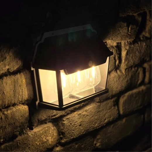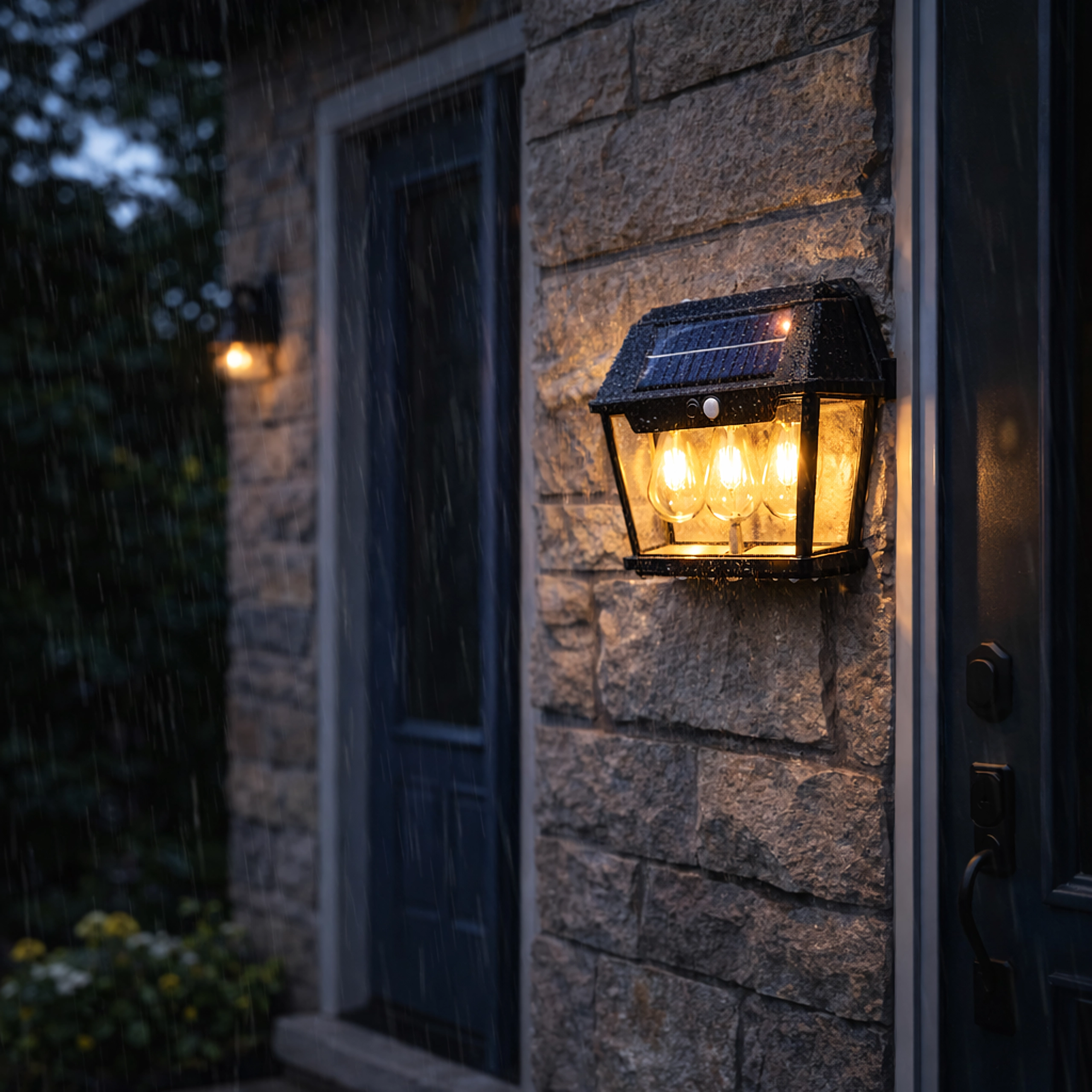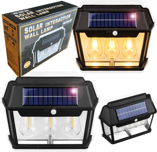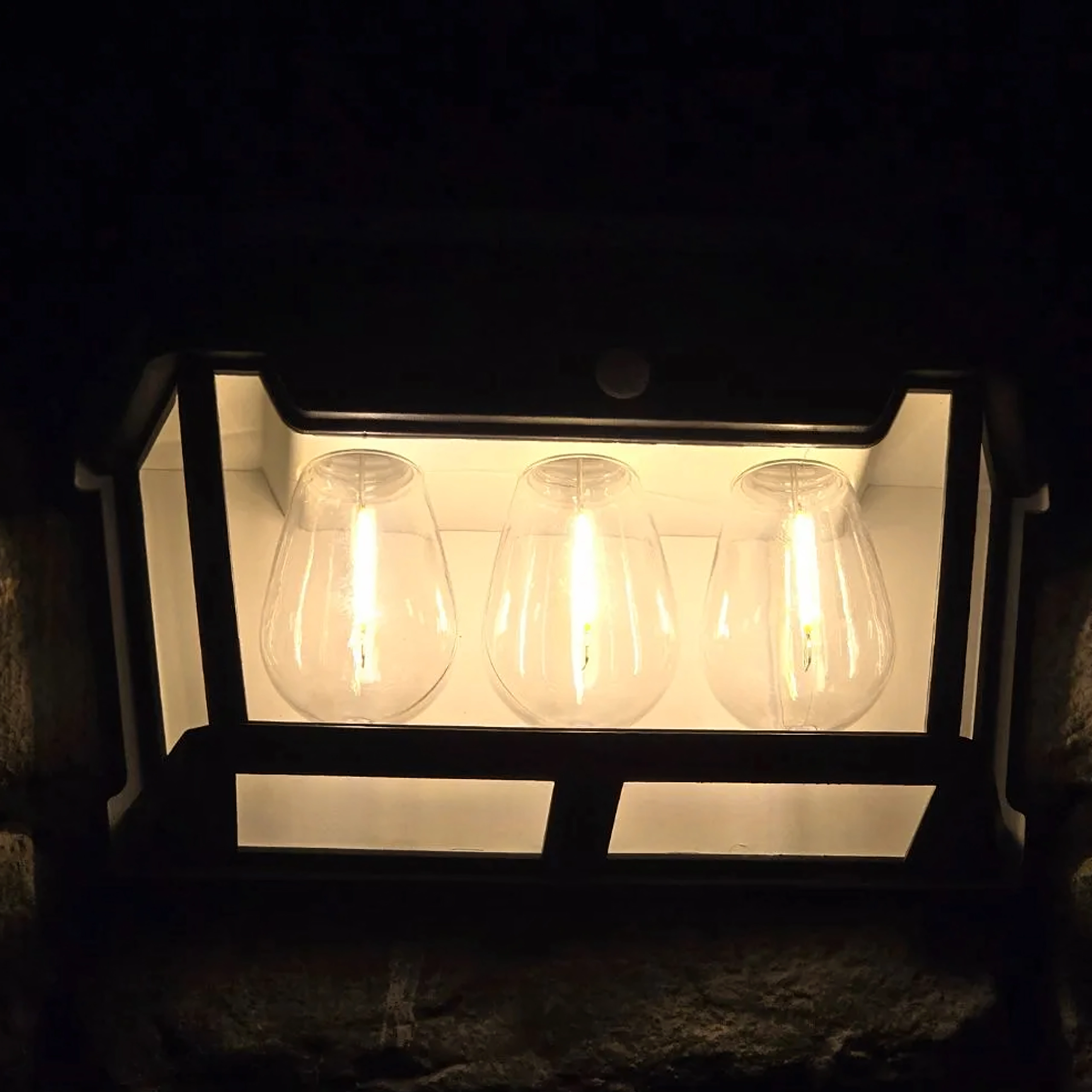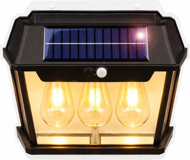 Elegante zonne-wandlamp in lantaarnstijl met drie LED-bronnen zorgt voor automatische verlichting zonder bekabeling. Het geïntegreerde zonnepaneel laadt overdag op en activeert ’s avonds energiezuinig warm licht, dat bij detectie van beweging feller oplicht. De duurzame constructie is geschikt voor buiten aan gevels, terrassen, balkons of entrees.