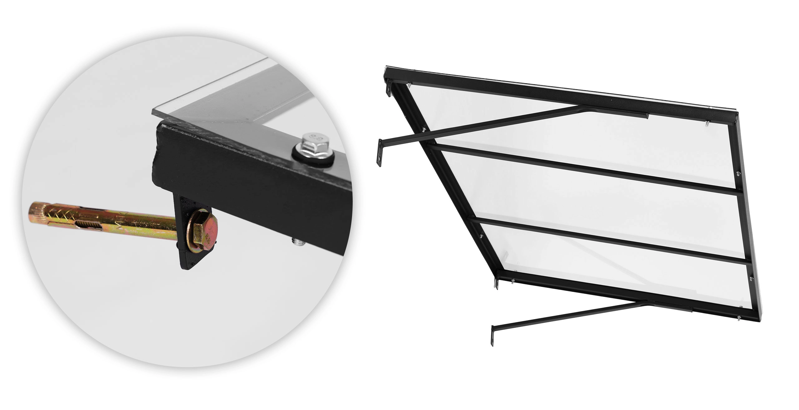 Dankzij de voorbereide montagepunten en de meegeleverde set van vier ankers (8,5 cm) bevestigt u de luifel snel en stevig aan de gevel zonder extra accessoires te hoeven aanschaffen.