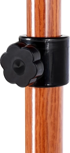 De stevige metalen stang met klem zorgt voor stabiliteit en eenvoudig verstellen van de hoogte, terwijl de uitstraling doet denken aan natuurlijk hout.