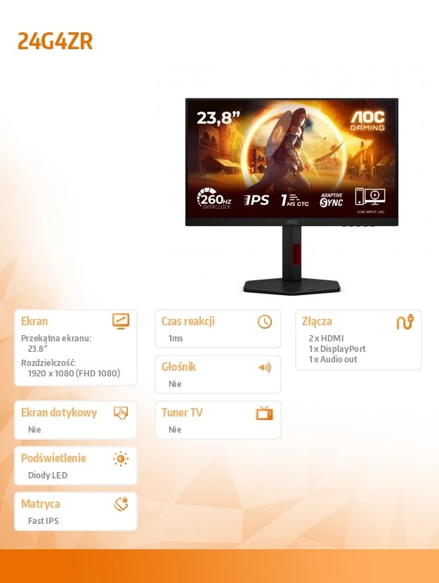 Krijg een voorsprong met de 23,8" gamingmonitor van AOC met een Fast IPS‑paneel en een verversingssnelheid tot 240 Hz. Geniet van een snelle responstijd, vloeiend beeld, rijke kleuren en ergonomie met draaiing naar portret (Pivot) – ideaal voor competitief gamen én dagelijks werk.