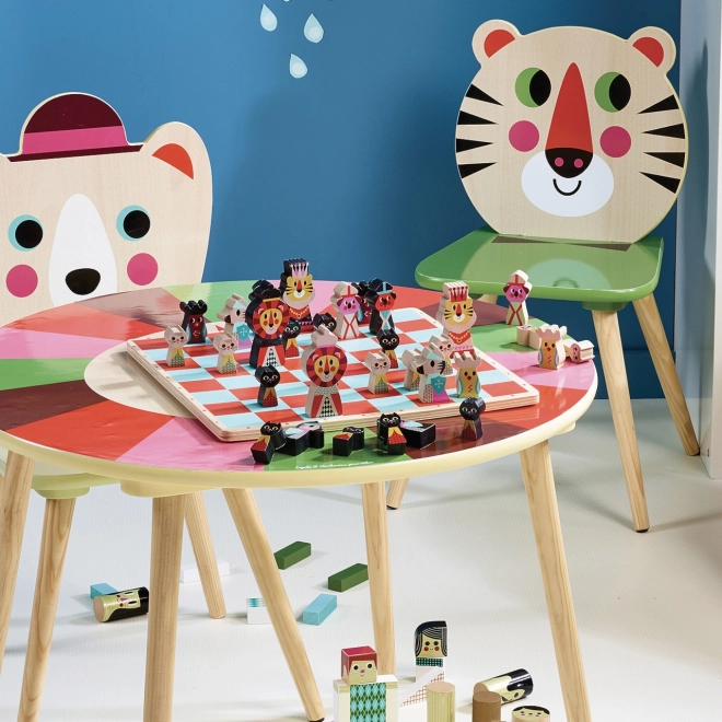We introduceren een houten schaakspel met dierenmotieven, ideaal voor kinderen vanaf 6 jaar. Dit spel bevordert niet alleen strategisch denken, maar ontwikkelt ook de zintuigen dankzij de kleurrijke en speelse vormgeving. Het schaakbord en de stukken zijn geïllustreerd door de talentvolle Ingela P. Arrhenius, een bekende Zweedse kunstenares wiens passie voor retrostijl in elk detail van deze set zichtbaar is.
