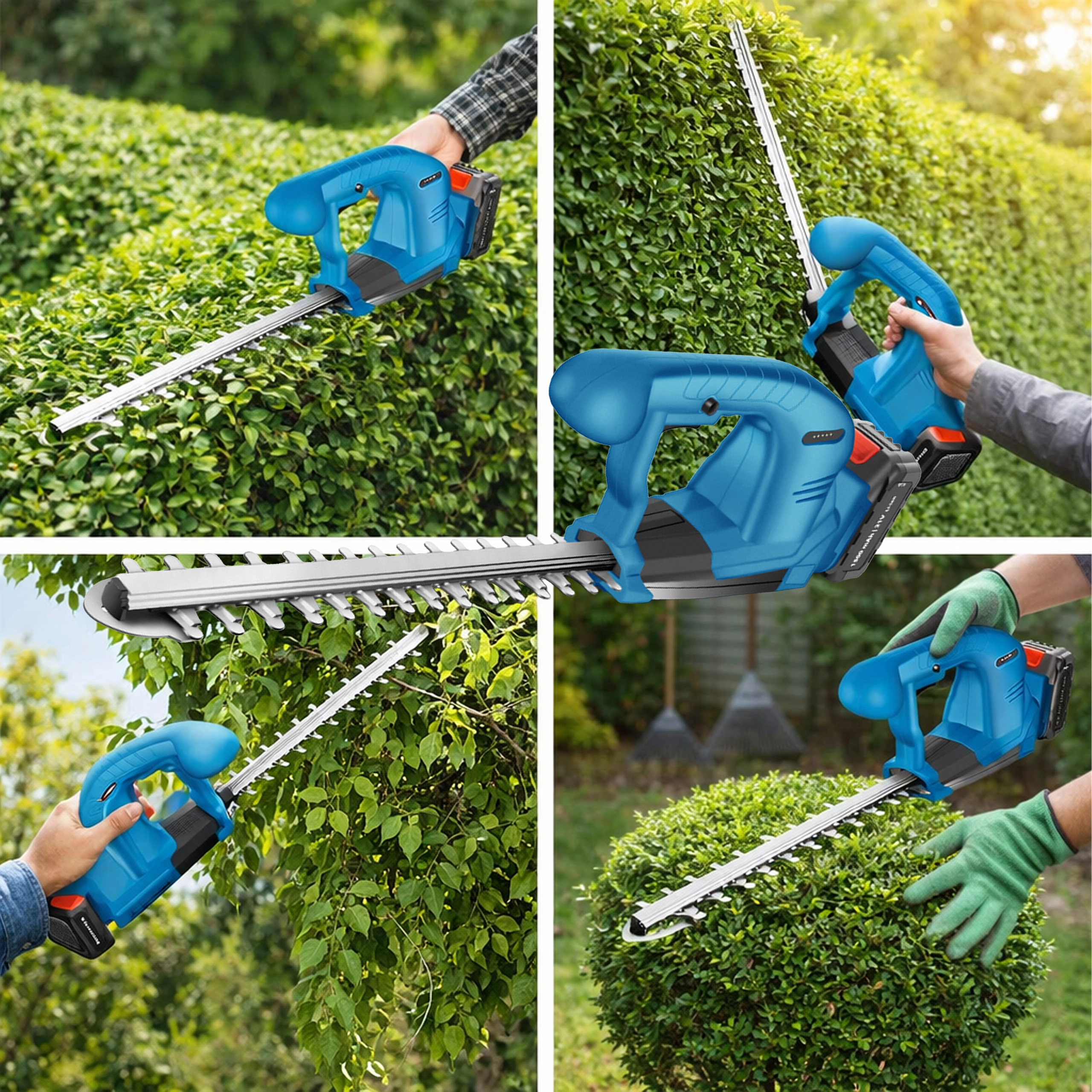 Deze accu-heggenschaar is ideaal voor regelmatig tuinonderhoud. De lange, dubbelzijdige balk met scherpe tanden zorgt voor een schone en gelijkmatige snede van takken en bladeren, terwijl de ergonomische handgreep en de voorste beschermer de controle en veiligheid tijdens het werk verhogen. Zonder kabel heeft u volledige bewegingsvrijheid door de hele tuin.