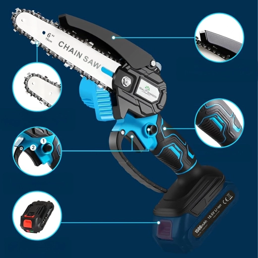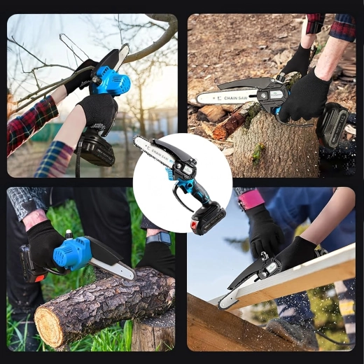 De compacte accu mini-kettingzaag is ideaal voor het snel snoeien van takken, het zagen van kleinere blokken en tuinwerk. Dankzij de lichte constructie en ergonomische handgreep biedt hij eenvoudige bediening, draadloze draagbaarheid en veiliger zagen met een kettingbeschermkap. Een uitstekende keuze voor hobbygebruik en regulier onderhoud van bomen en struiken.