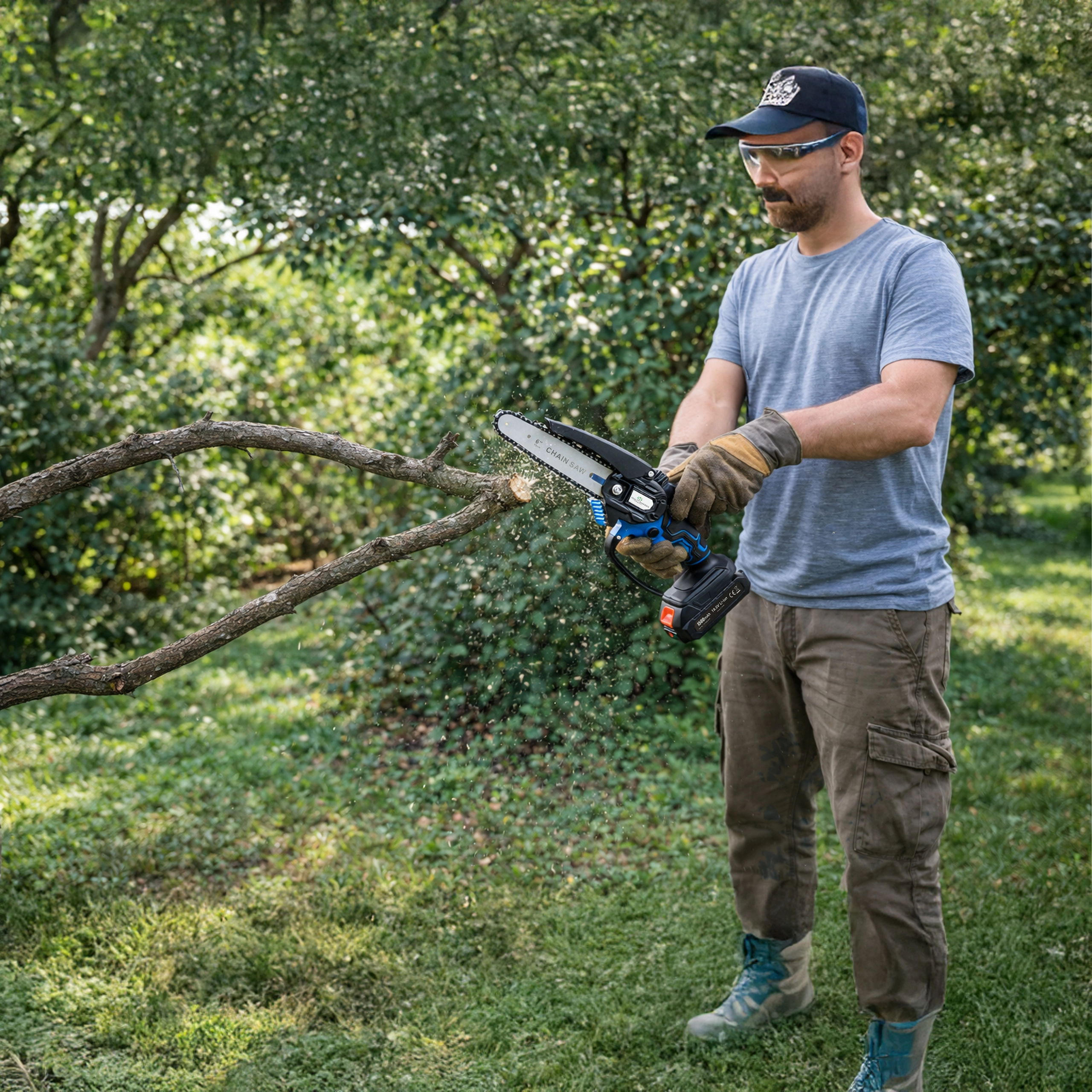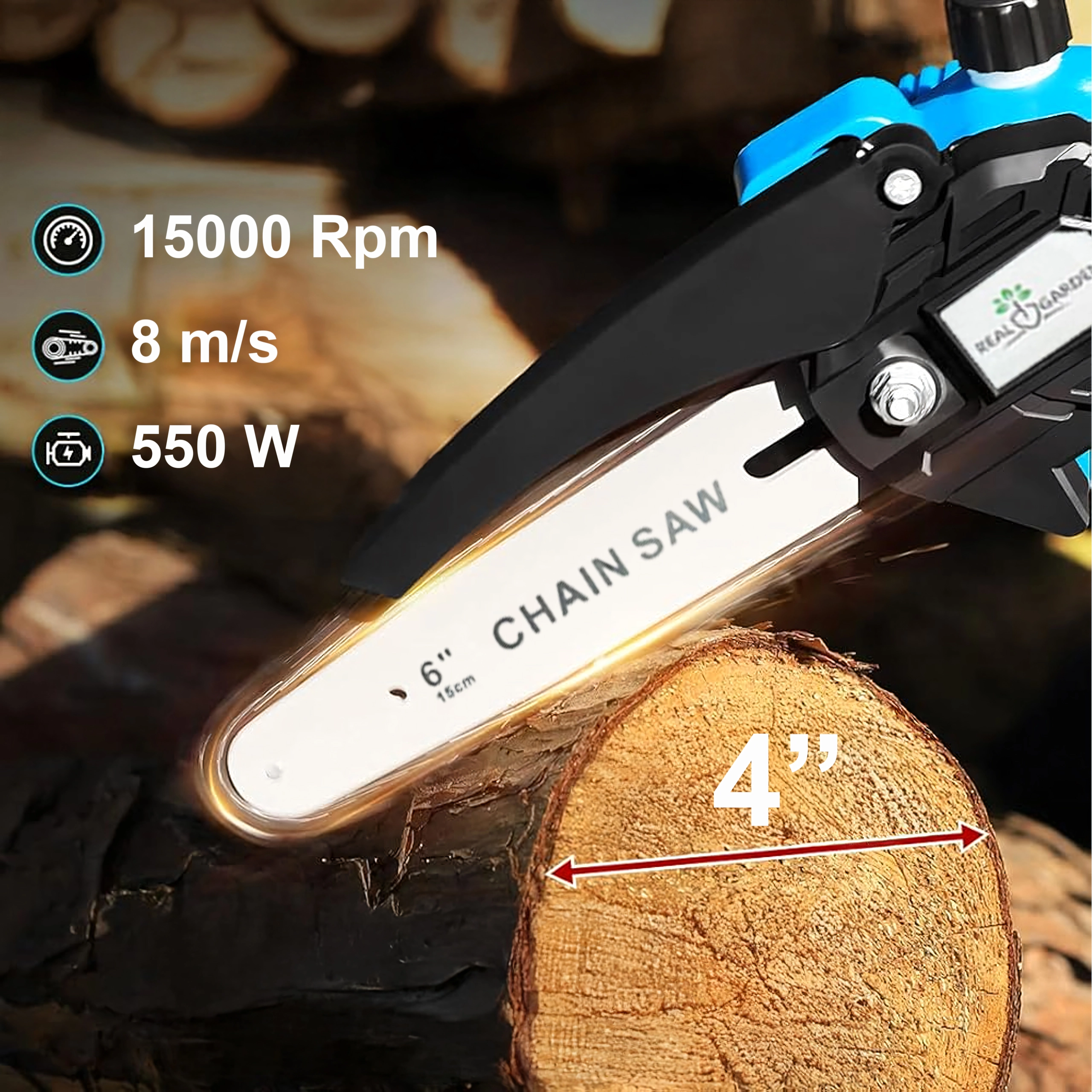 Een 6" geleider met een scherpe ketting zaagt takken en kleinere blokken snel en schoon – ideaal voor tuinonderhoud zonder onnodige inspanning.