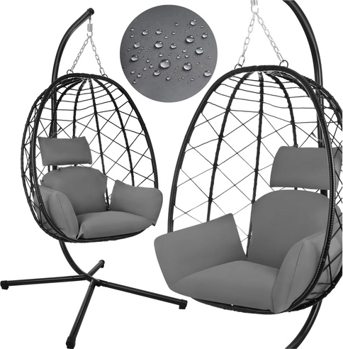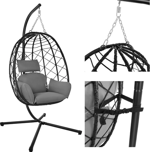 - stoel-cocon, waterafstotende kussens, metalen standaard, ketting, montageset, handleiding, karton