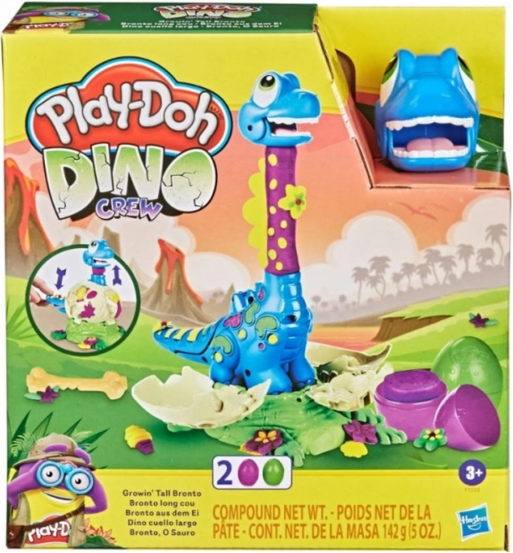 Help de kleine Bronto uit het ei te komen en kijk hoe zijn nek groeit! Vul gewoon de PLAY-DOH-figuur en druk op de staart – de nek schuift uit en het plezier kan beginnen. Met de vormpjes op de figuur en het ei maak je bladeren, bloemen, botten en een stijlvolle strik.