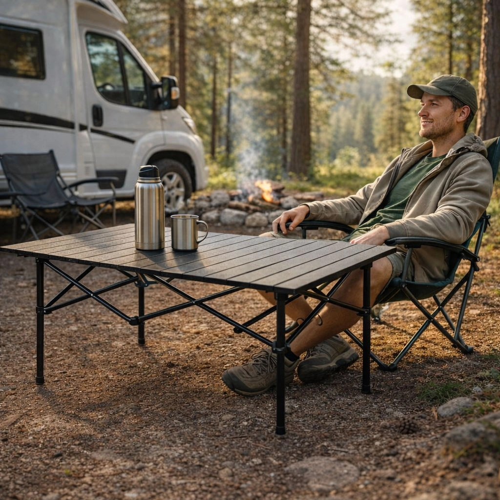 Praktische opvouwbare kampeertafel MultiGarden met afmetingen 95 × 55 cm, met een lichte maar stevige constructie van koolstofstaal, een oprolbaar lamellenblad en antislipvoeten. Eenvoudig gereedschapsloos uit te klappen, draagvermogen tot 20 kg en dankzij de draagtas ideaal voor kamperen, picknicks en barbecues.