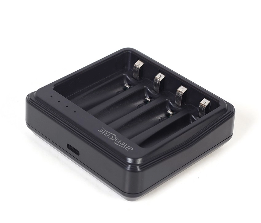 De oplader gebruikt LED-controlelampjes voor elke sleuf, zodat u direct de status van afzonderlijke batterijen ziet. Voeding via USB/USB‑C zorgt voor brede compatibiliteit – gebruik de telefoonlader, powerbank of USB‑poort van uw laptop.