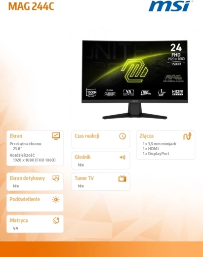 MAG 244C combineert een compacte 23,6"-diagonale, een gebogen paneel en een hoge 180 Hz-frequentie voor een uitzonderlijk vloeiend beeld zonder storend tearing. De Full HD-resolutie is ideaal voor games, multimedia en productiviteit, terwijl de kromming het gezichtsveld natuurlijk volgt en het kijkcomfort vergroot.