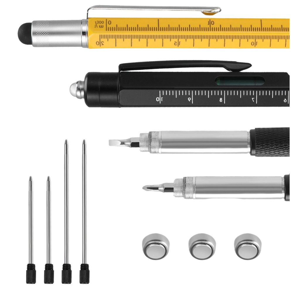 Bespaar ruimte en tijd met een universele set die schrijven, meten en snelle kleine reparaties combineert. De zwarte 9-in-1 pen is uitgerust met een LED-zaklamp voor werken onder minder ideale omstandigheden, een geïntegreerde waterpas voor uitlijning, een geprinte schaalverdeling, stylus, flesopener, telefoonhouder en twee schroefbits (plat/kruiskop). De gele pen vult de meest gebruikte functies aan – stylus, liniaal en schroevendraaier – in een duurzame metalen behuizing met zekere grip.