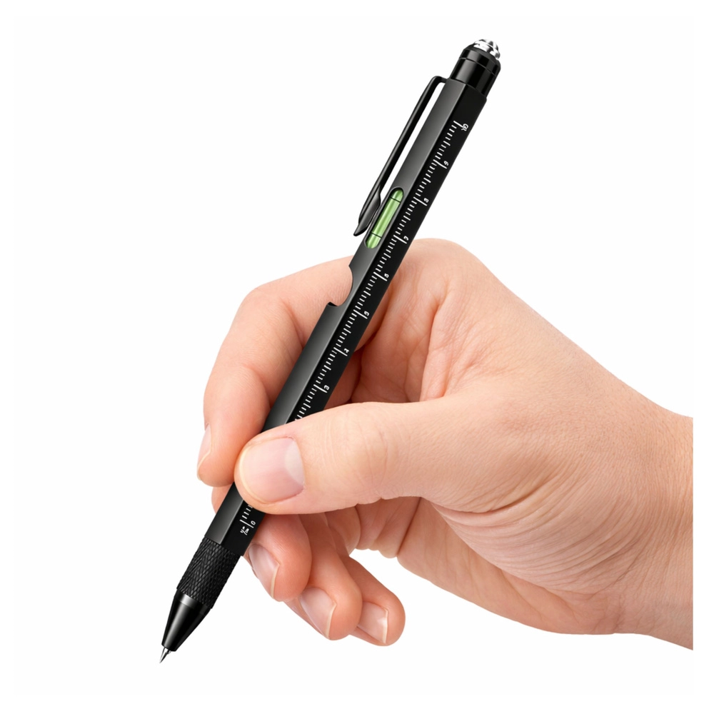 De zwarte pen combineert een LED-lamp, waterpas, liniaal, stylus, flesopener, telefoonhouder en schroevendraaiers (plat/kruiskop). Ideaal voor snelle aanpassingen, meten en notities.