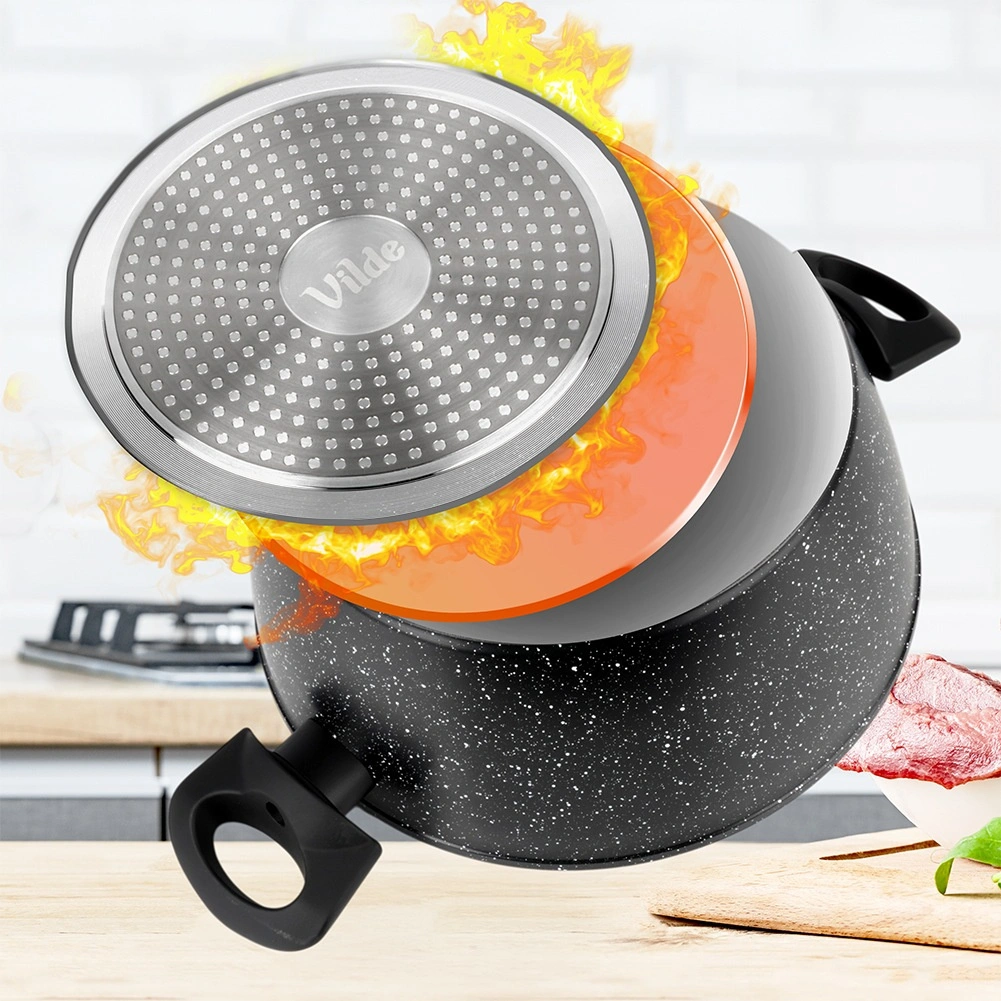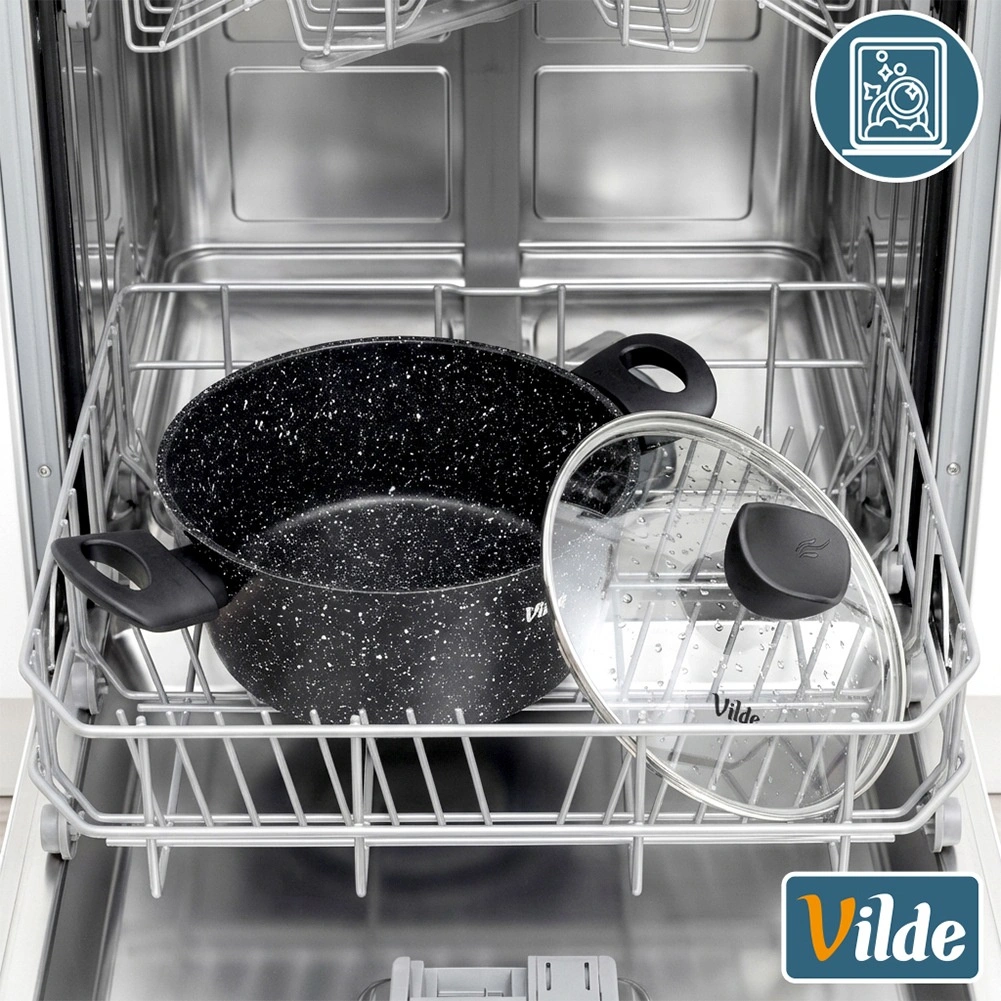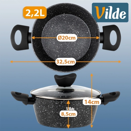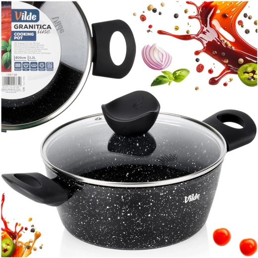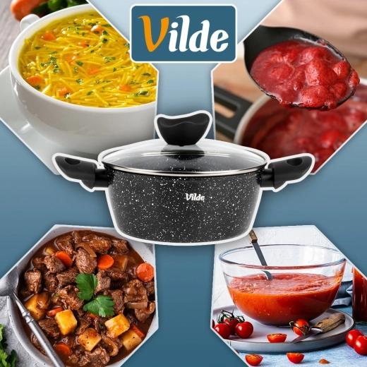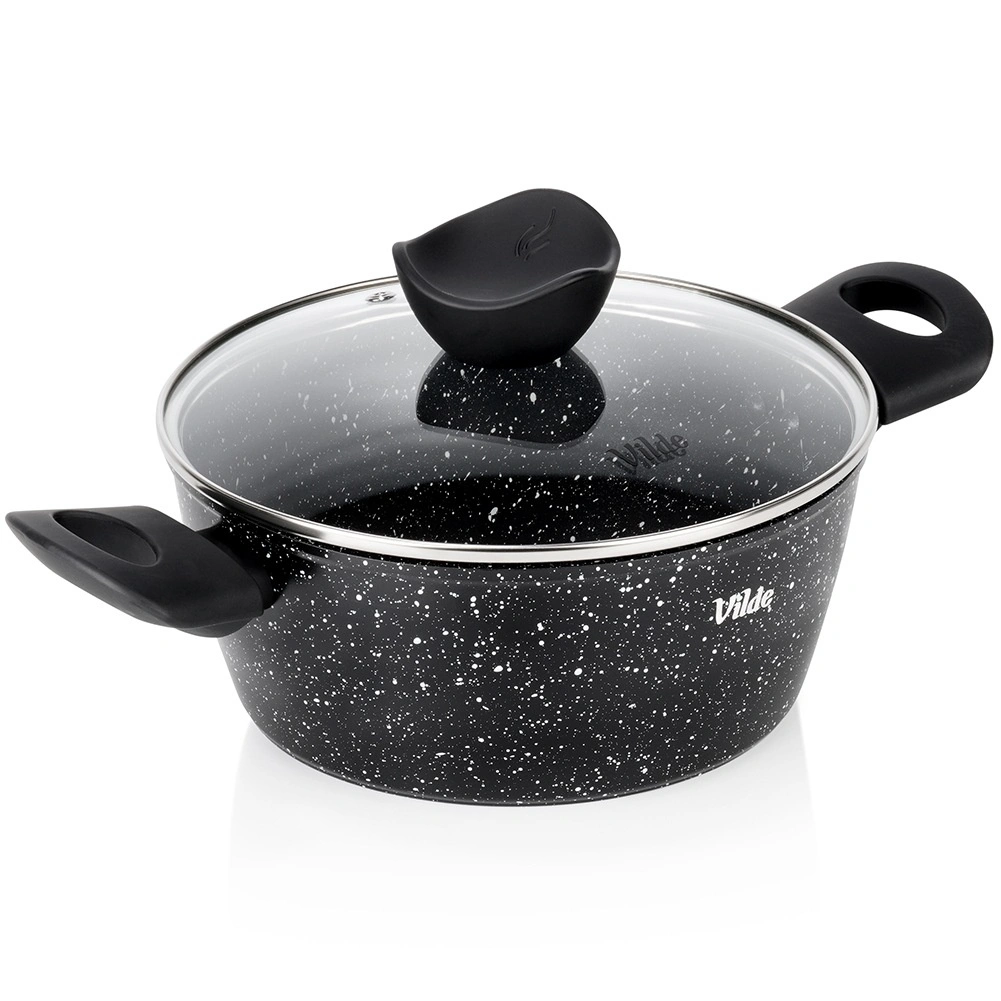 VILDE Granitica Line biedt een combinatie van duurzaamheid en comfort. De antiaanbak granietlaag voorkomt aanbakken, het glazen deksel met stoomventiel vergemakkelijkt de kookcontrole en ergonomische handgrepen met soft-touch afwerking verhogen de veiligheid en het comfort bij het hanteren.