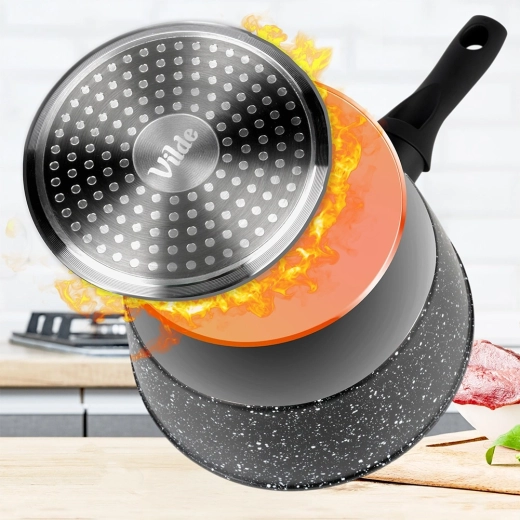 De meerlaagse granieten afwerking minimaliseert aanbakken en maakt koken met minder vet mogelijk. Reiniging is snel en moeiteloos.