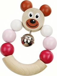 Een schattige houten rammelaar met een beertje in roze zal elke baby blij maken. Het geïntegreerde belletje rinkelt zacht, de rammelaar is zeer licht en dankzij de compacte afmetingen van 7 × 9 cm ligt hij perfect in kleine handjes. Het product voldoet aan de strenge EU-veiligheidseisen voor speelgoed en is voorzien van het certificaat Veilig speelgoed.