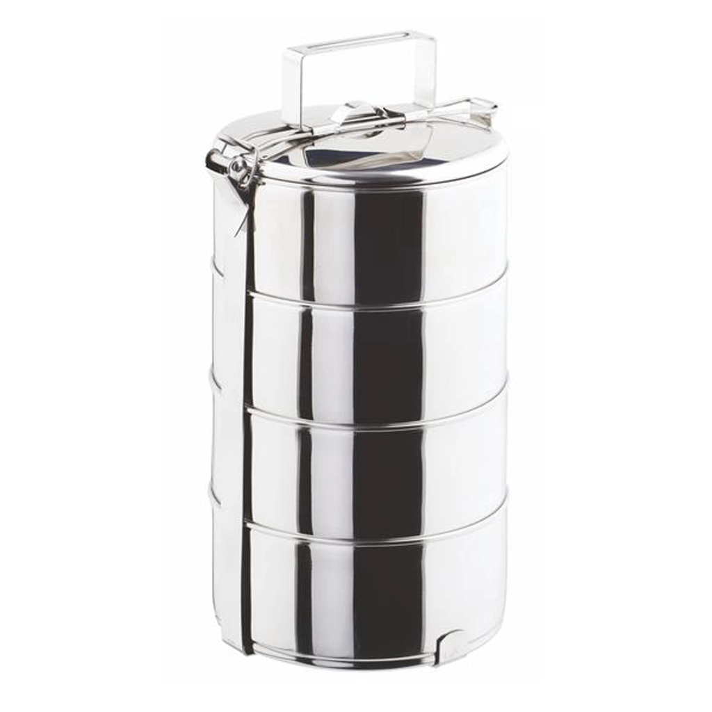 De praktische roestvrijstalen TORO-voedselcontainer met vier lagen is ideaal voor het vervoeren en bewaren van bereide maaltijden. Biedt een totaal volume van 5 l (4 × 1,25 l), vier afzonderlijke kommen met een diameter van 16 cm en een hoogte van 6,7 cm, stevige metalen verbinding en eenvoudig onderhoud in de vaatwasser.