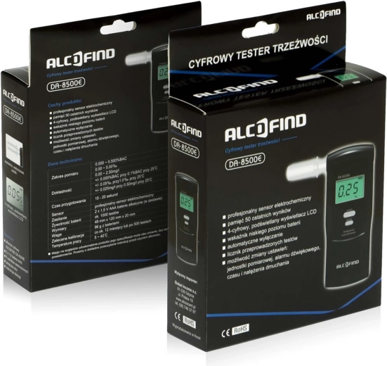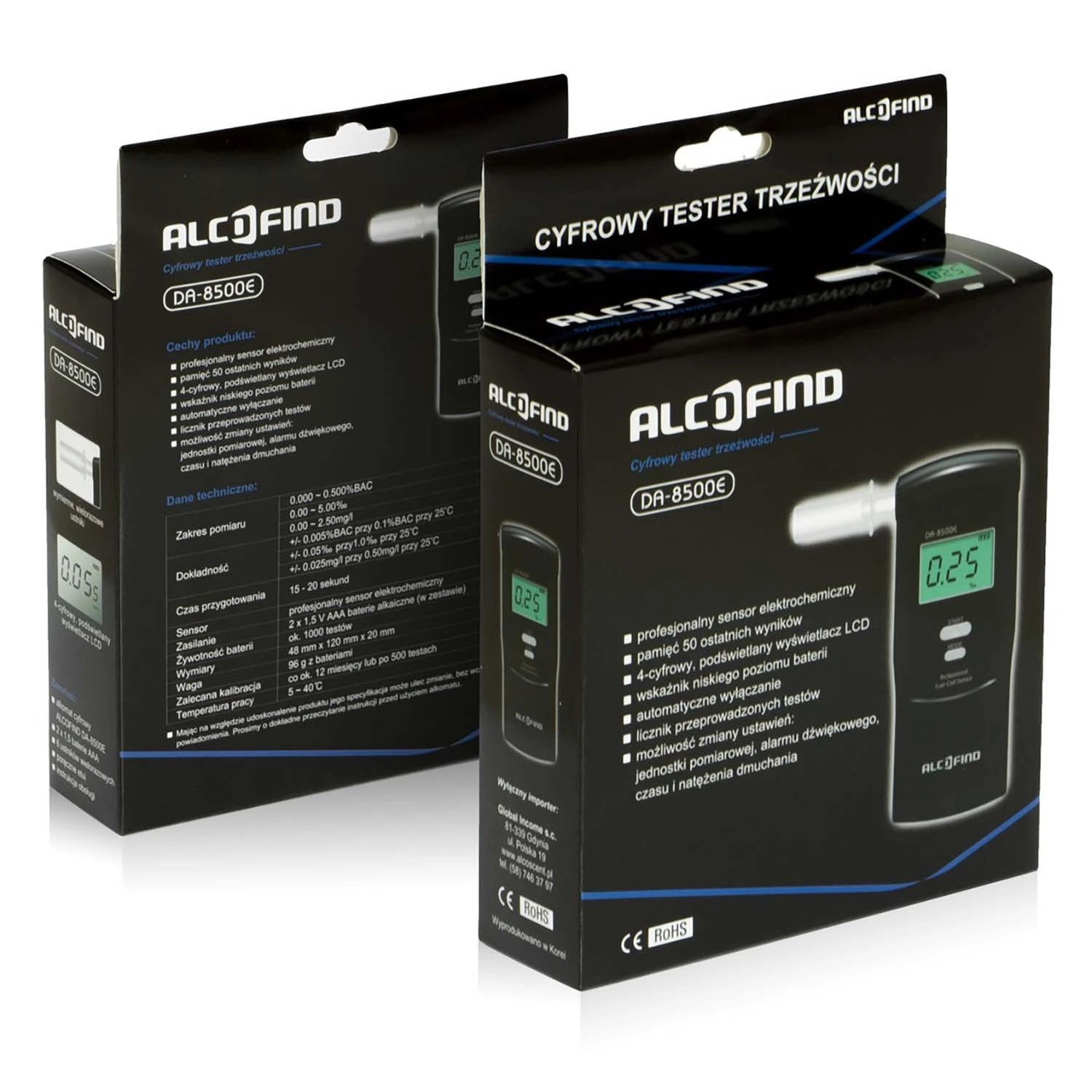 - Alcoholtester DA-8500E, etui, 2× AAA, 6× herbruikbaar mondstuk, 100× wegwerpmondstuk, handleiding CZ, geschenkverpakking, garantiebewijs, gratis kalibratie binnen 12 maanden