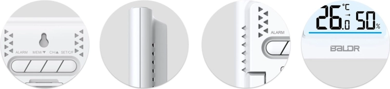 - Binnen- en buitenmeting van temperatuur en vochtigheid, registratie van MIN/MAX