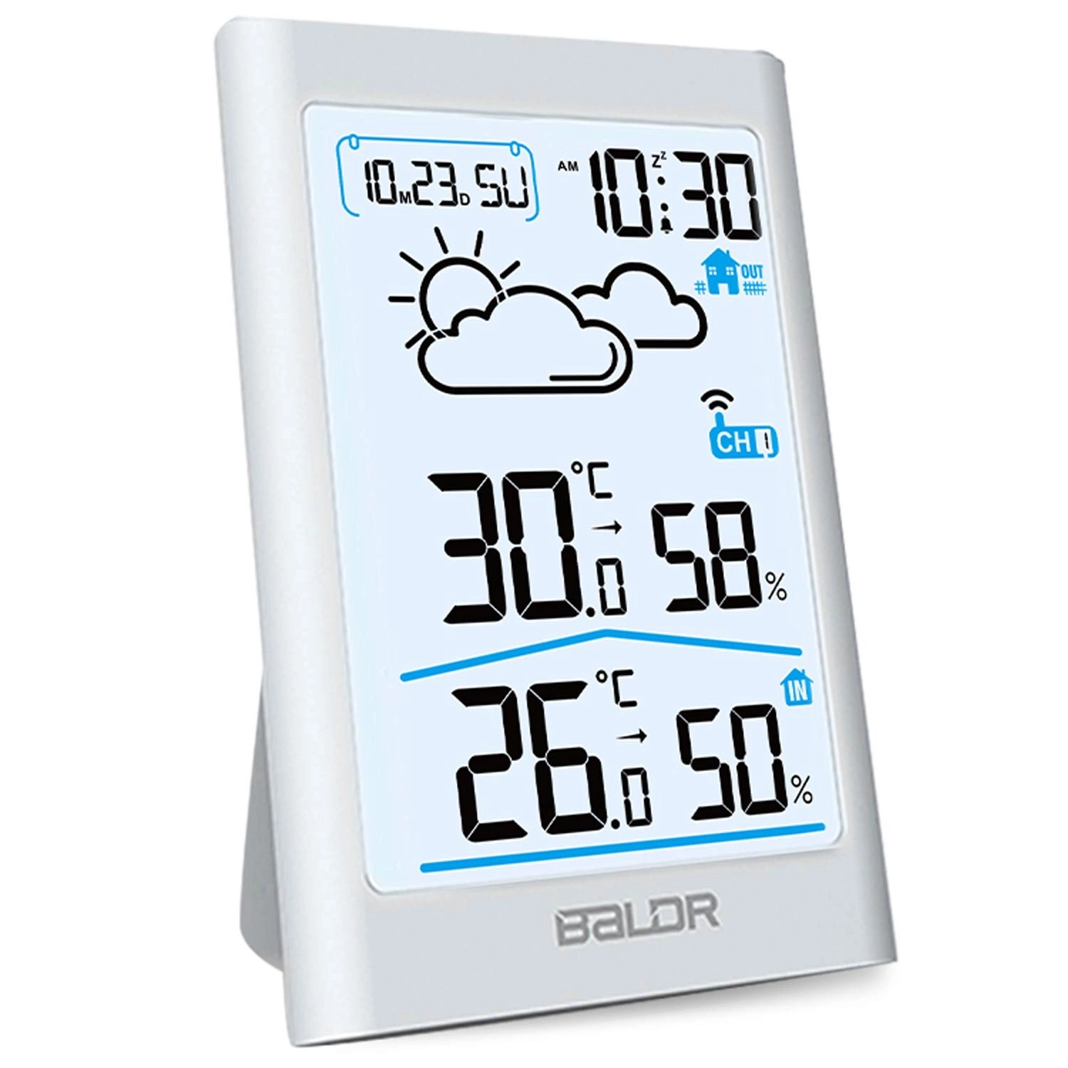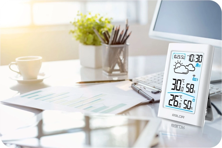Het contrastrijke display toont tijd, datum, temperatuur, vochtigheid en weerpictogrammen. De achtergrondverlichting zorgt voor comfortabel gebruik overdag en ’s nachts.