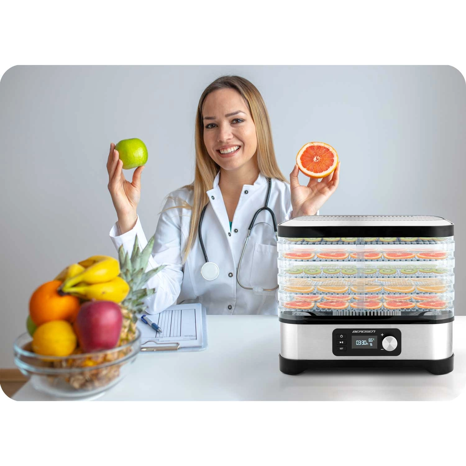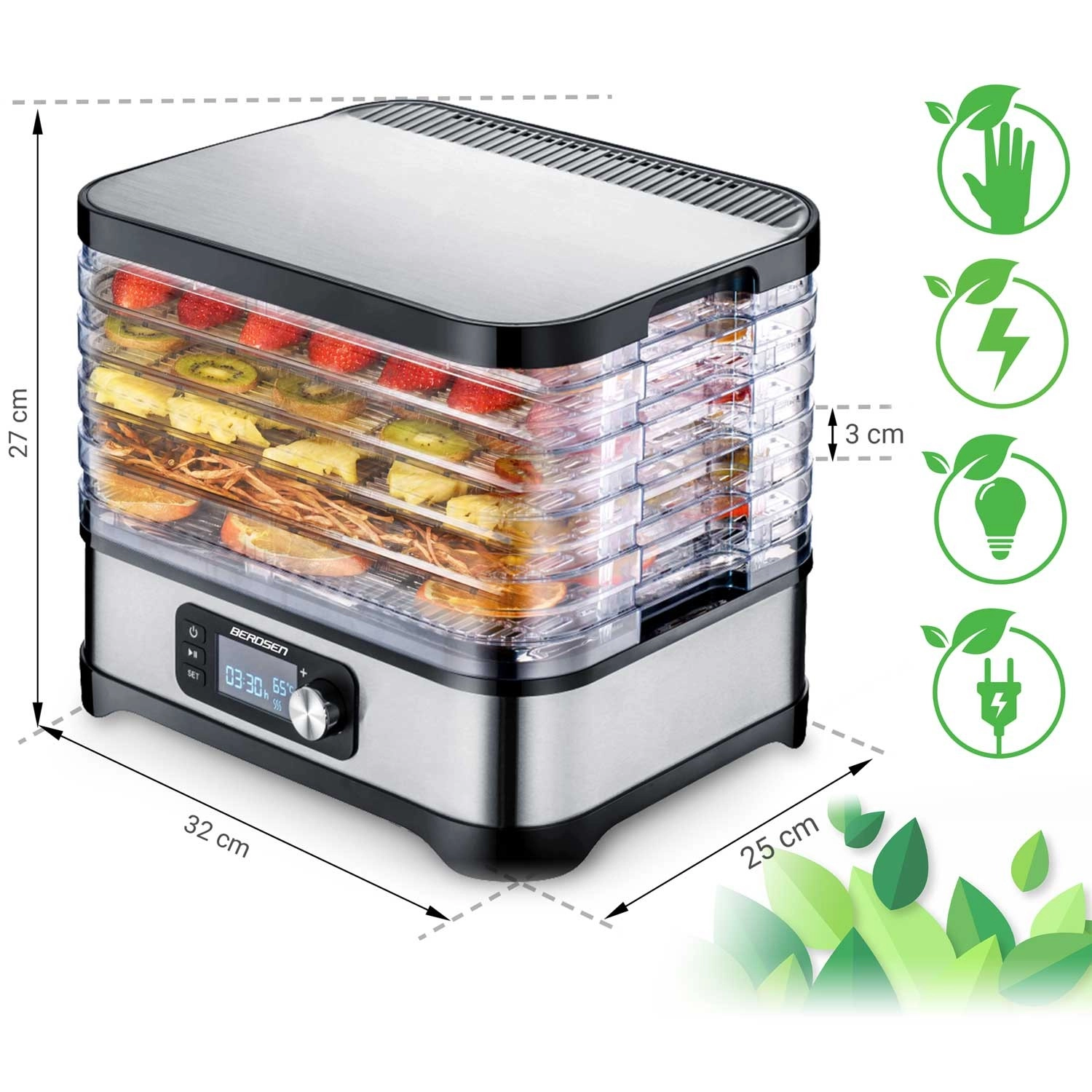 Geniet het hele jaar door van gezonde snacks – gedroogde appels, pruimen, aardbeien, kruiden en paddenstoelen bereid je precies naar smaak. De Berdsen droger combineert een krachtig verwarmingselement van 400 W met nauwkeurige elektronische temperatuurcontrole, waardoor hij zacht en gelijkmatig droogt. Met het intuïtieve paneel stel je een timer van 1–24 uur in voor zorgeloos gebruik.