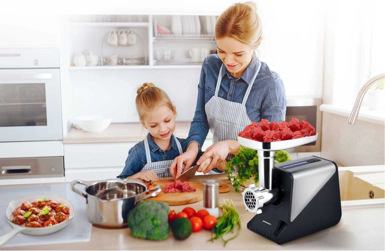 De 800 W motor (max. 2000 W) met reverse-functie zorgt voor snelle verwerking van vlees en stevigere ingrediënten zonder verstopping. Drie schijven 3/5/7 mm voor een precieze textuur.