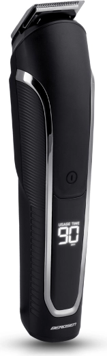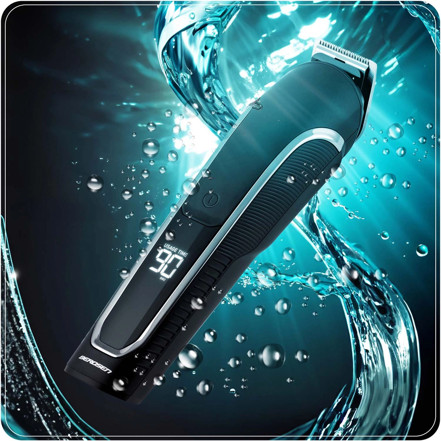 Universele 6-in-1 BERDSEN trimmer- en scheerset voor haar, baard en lichaam met LCD-display, scherpe stalen messen en batterij tot 90 minuten. Opladen via USB‑C, 5 verwisselbare opzetstukken en 5 kamopzetstukken (1–12 mm) voor nauwkeurig stylen, contouren en glad scheren. Ergonomisch, draadloos en klaar voor dagelijkse styling.