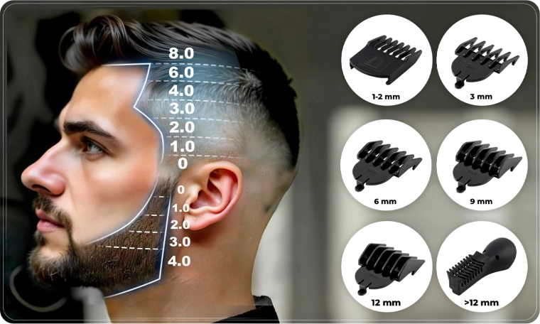 - Flexibele lengtes – opzetkammen 1–12 mm voor schaduweffecten en diverse stijlen.