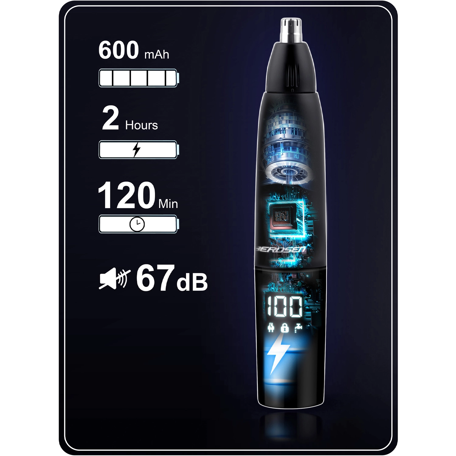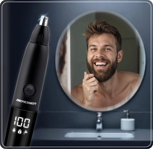 BERDSEN BD‑269 is een veelzijdige 3‑in‑1 trimmer voor neus, oren en detailafwerking van baard. De stalen dubbele messen zorgen voor een gladde en precieze snit zonder het risico op vastlopen. Het geïntegreerde lcd‑scherm toont de accustatus en toerental voor volledige controle over je styling.