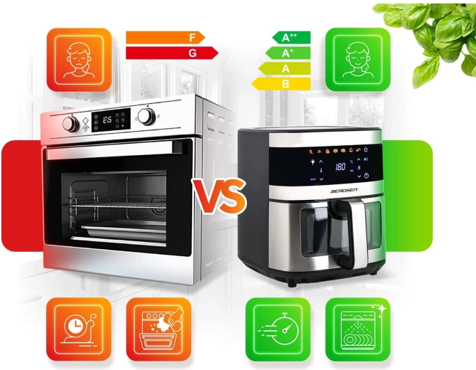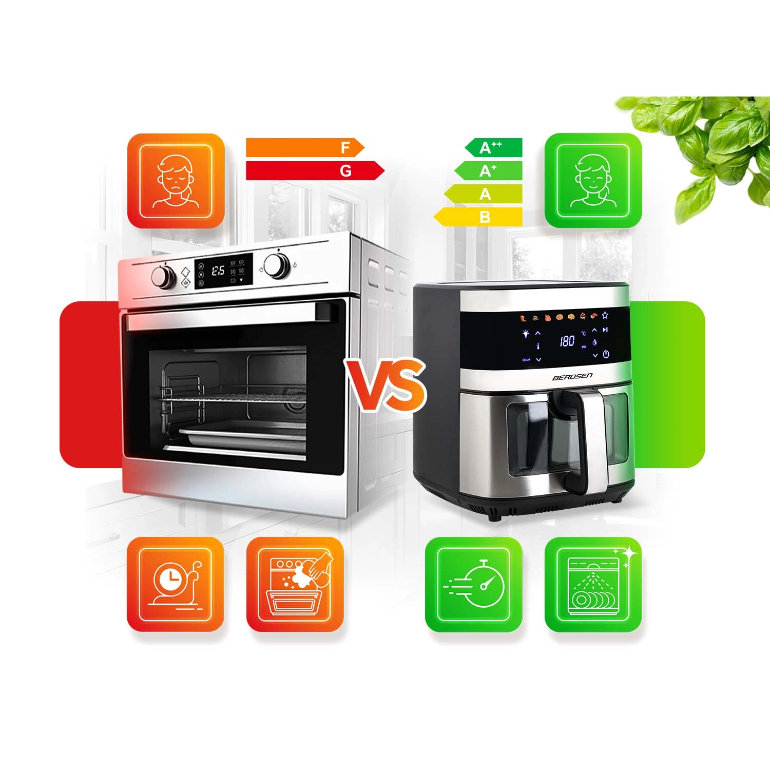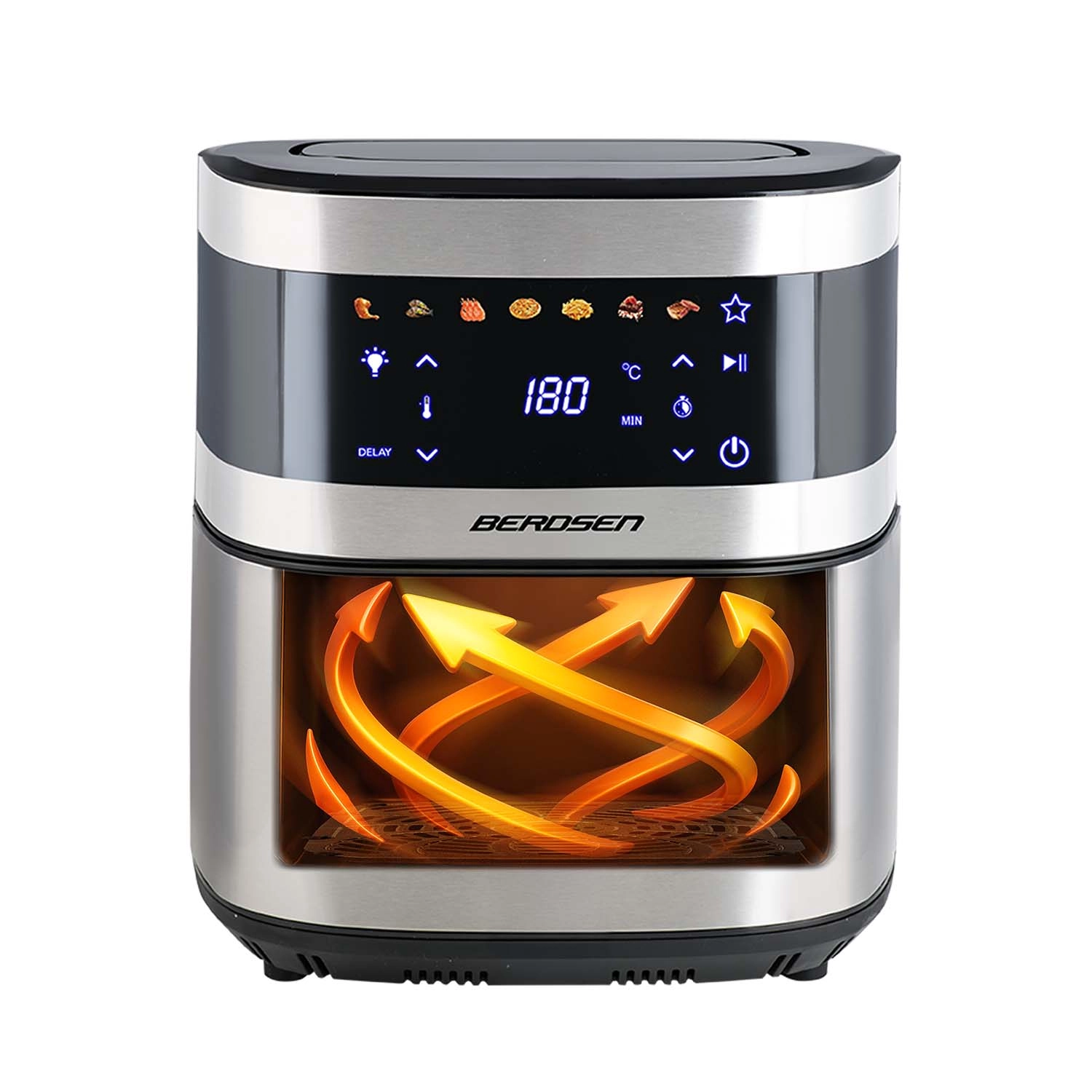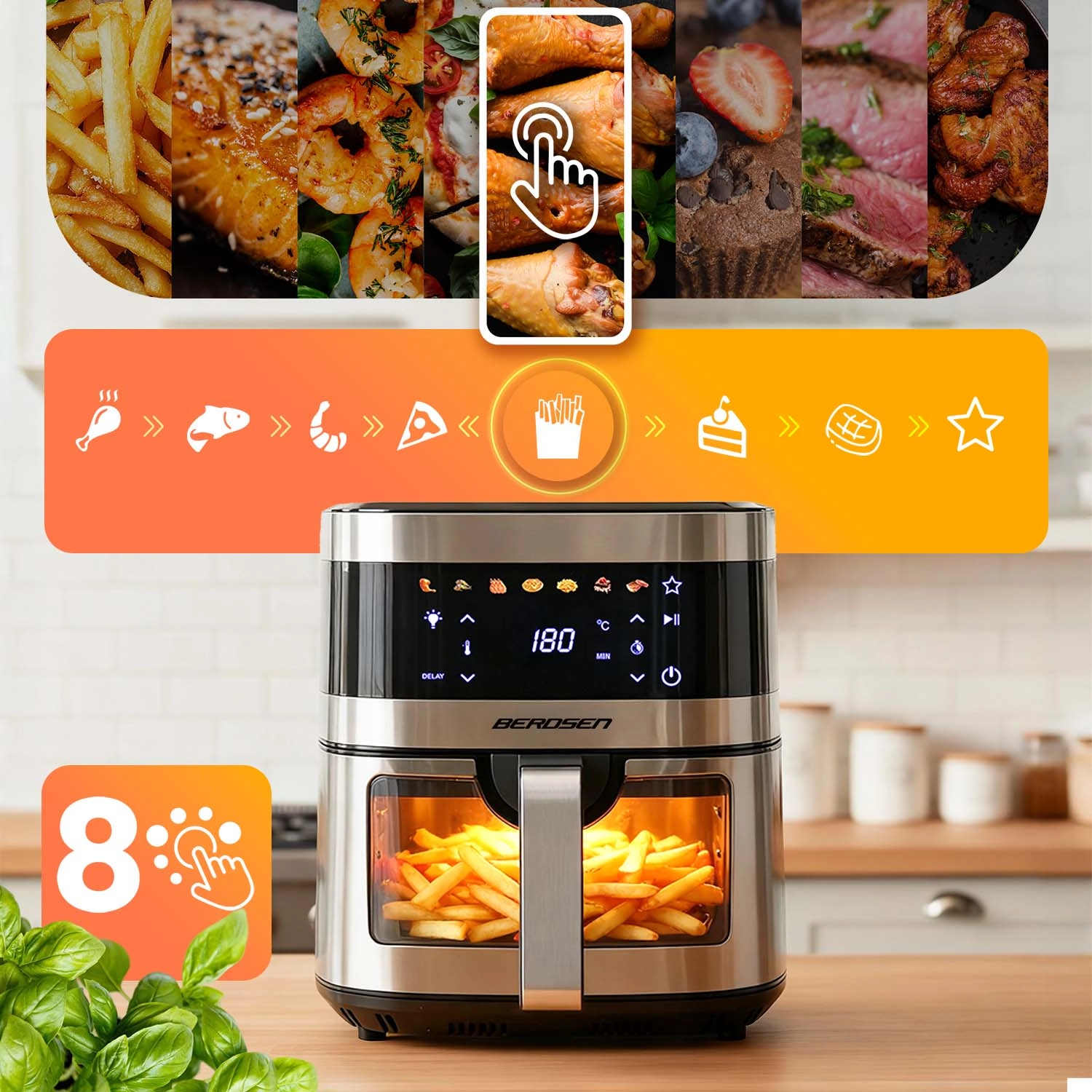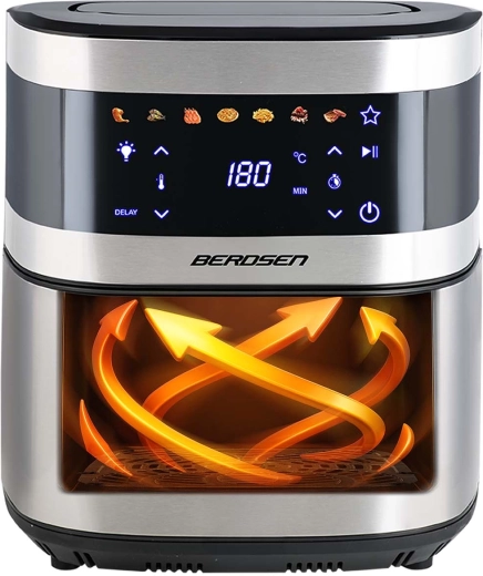 Ontdek comfortabeler en gezonder koken met de BERDSEN heteluchtfriteuse van 9,1 l. Dankzij de circulatie van hete lucht bereid je gerechten met tot 90% minder vet, en toch krokant van buiten en sappig van binnen. De grote capaciteit van 9,1 l, touchpanel met 7 programma’s, krachtige 1700 W en een kijkvenster met LED‑verlichting voor volledige controle zonder te openen maken dit model ideaal voor gezinnen en fijnproevers.