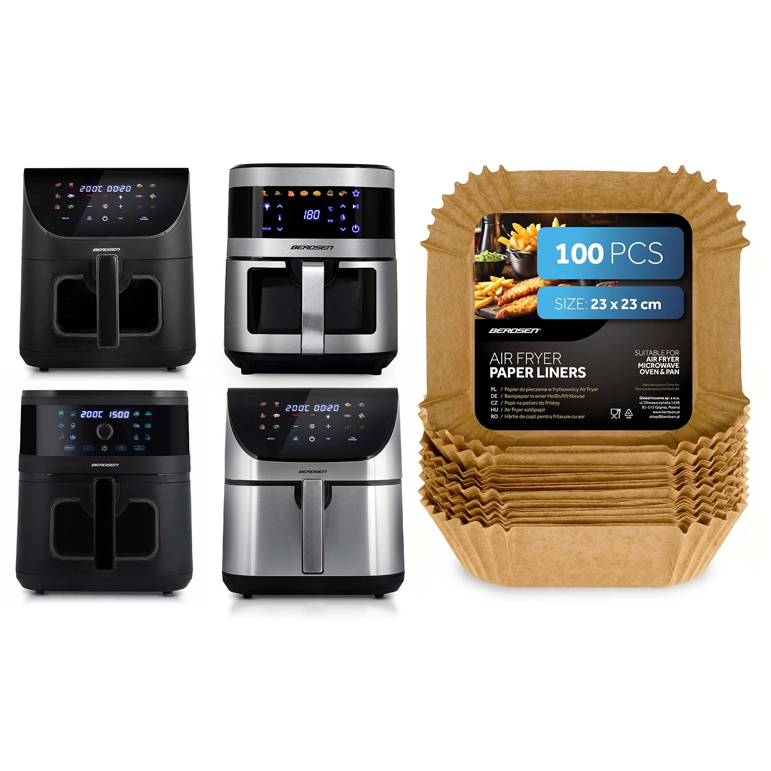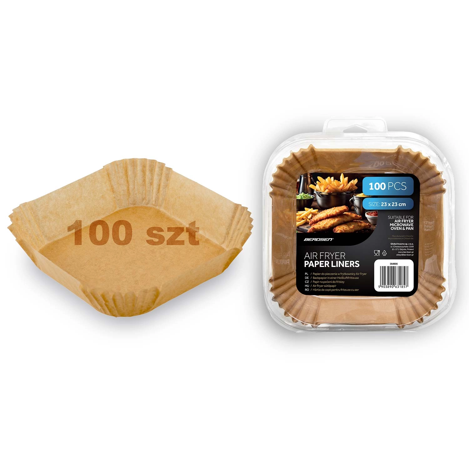 Maak koken en schoonmaken makkelijker met de wegwerp-inlegvellen voor de heteluchtfriteuse van Berdsen. Vierkante papieren bakjes van 23 × 23 cm met hogere randen vangen vet, kruimels en sauzen op, zodat de mand schoon blijft. De verpakking bevat 100 stuks en is ideaal voor bakken zonder aanbranden, snel serveren en minimaal schoonmaken.