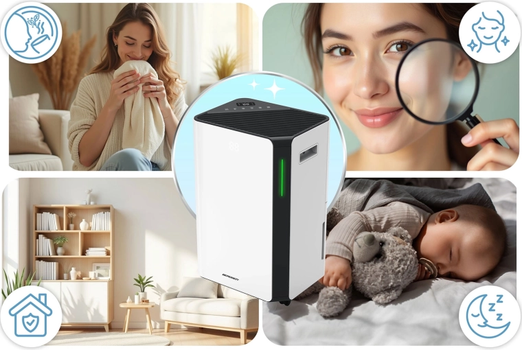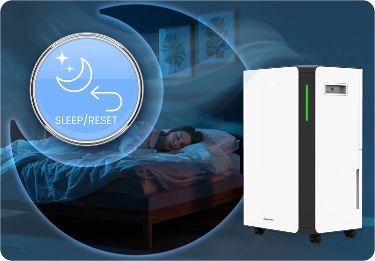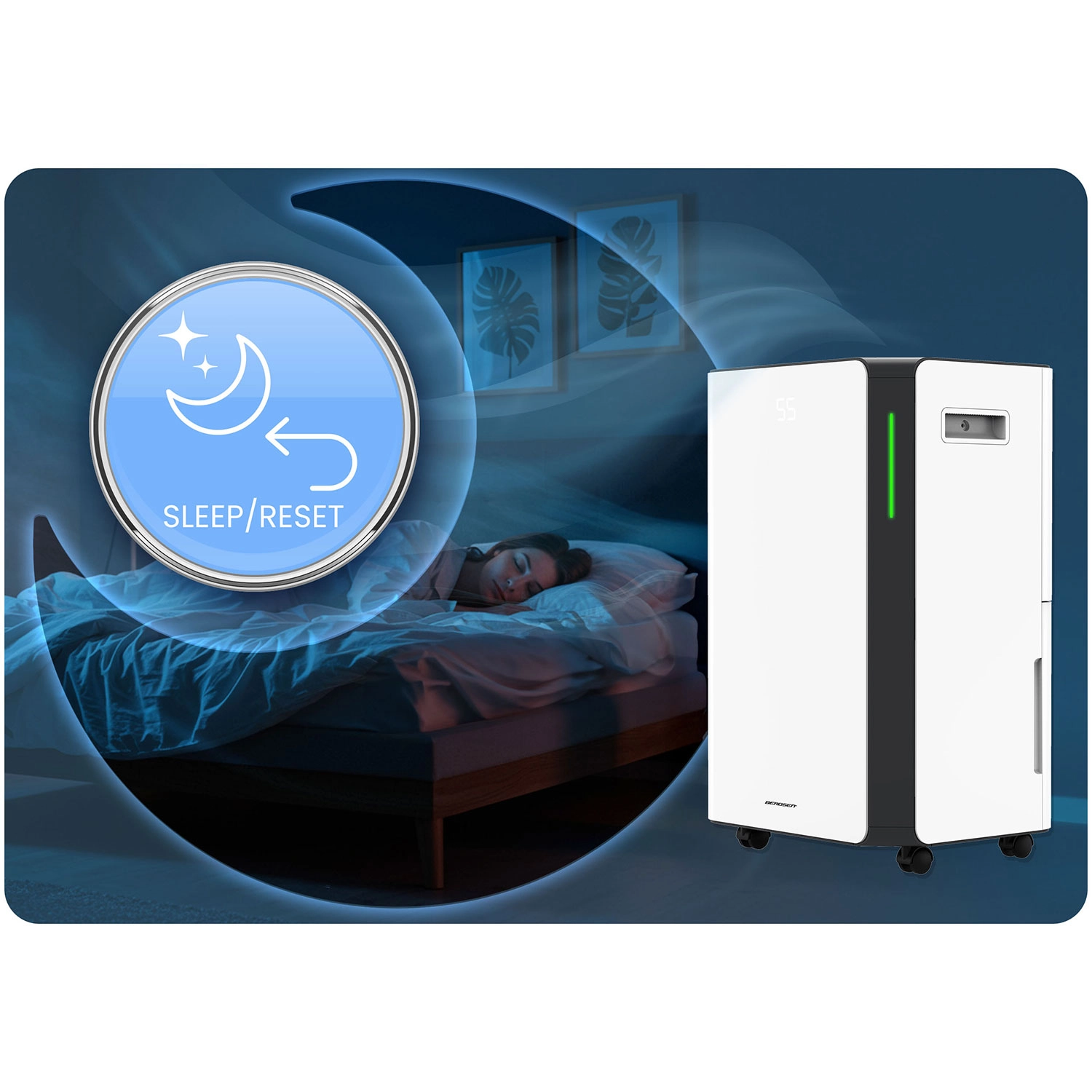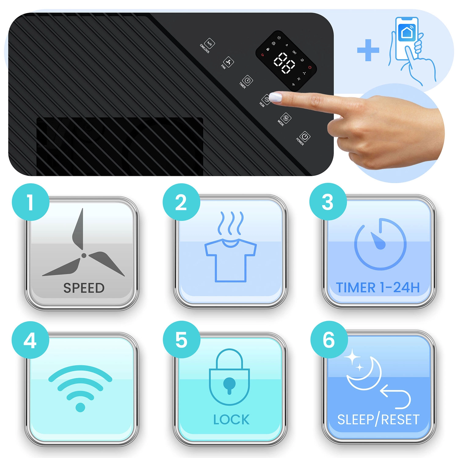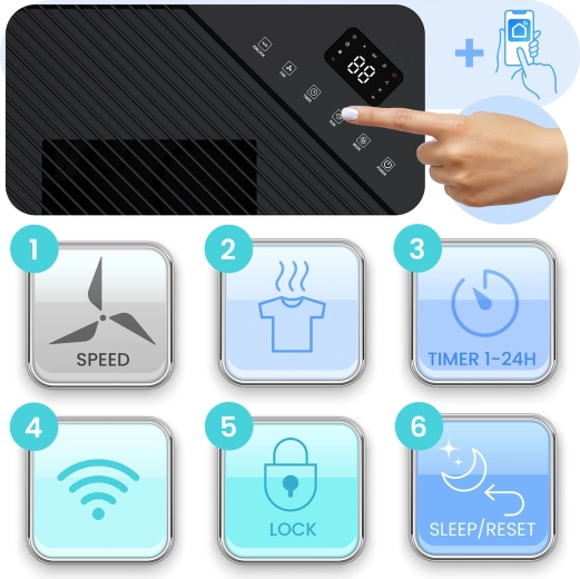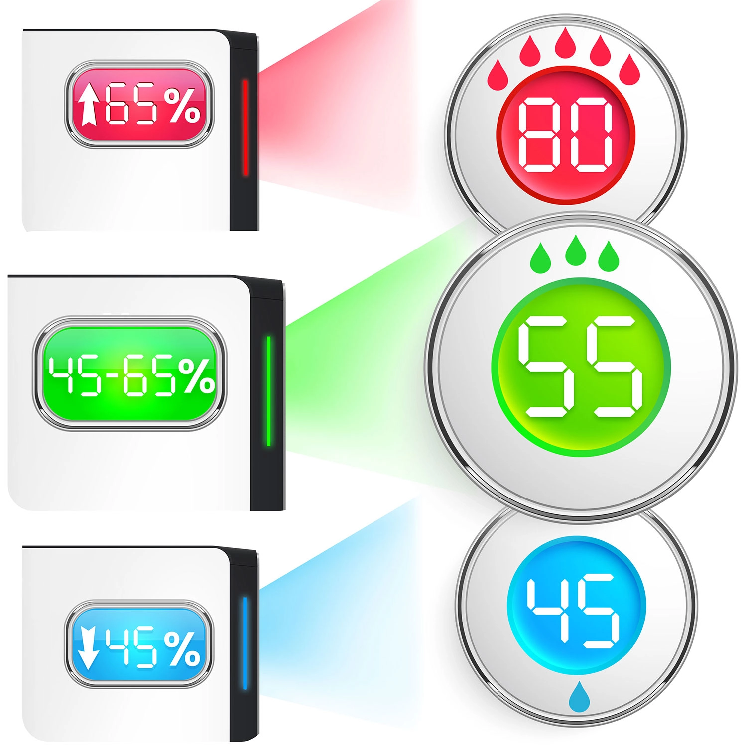 Bedien het apparaat lokaal via het touchpanel of op afstand via Wi‑Fi en de Tuya/Smart Life‑app. Beschikbaar zijn een timer 1–24 u, kinderbeveiliging, nachtmodus (Sleep) met gedimd display en een driekleurige LED‑indicator voor vochtigheid: rood (≥65%), groen (45–65%), blauw (≤45%). De stille werking ≤ 41 dB stoort niet tijdens werk of slaap.