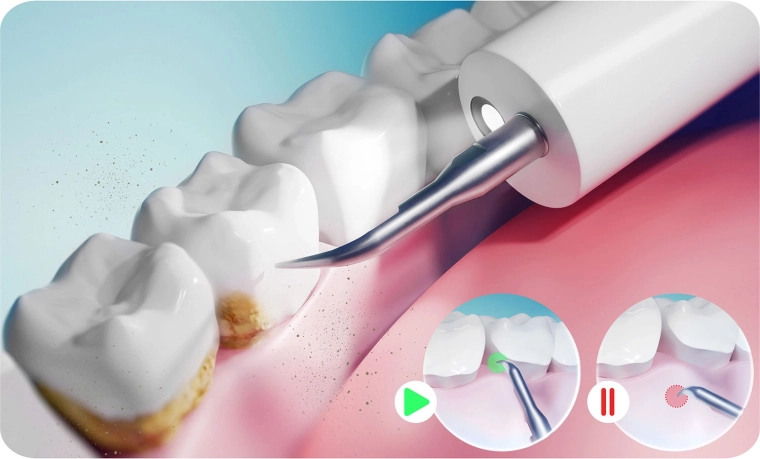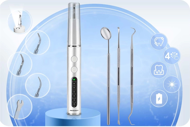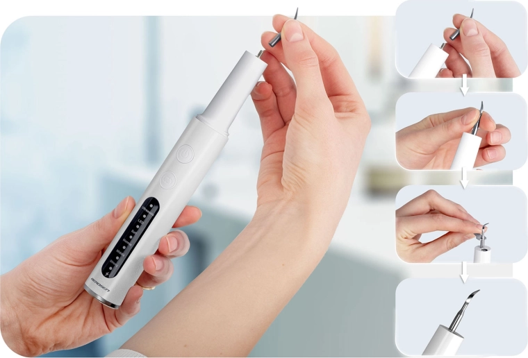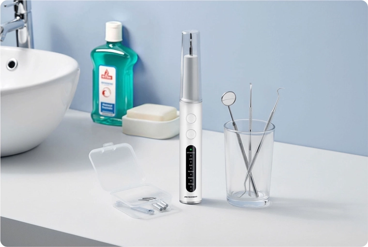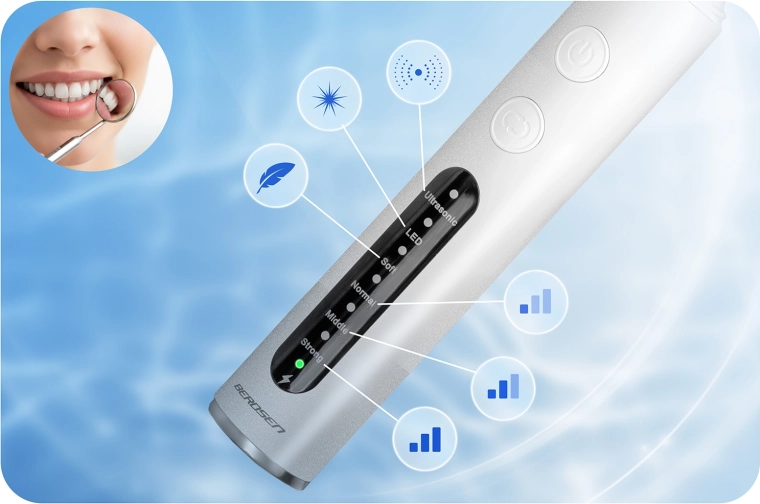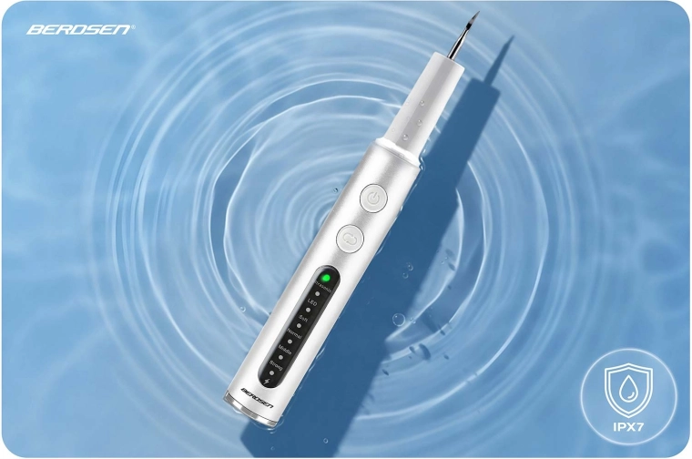 De ultrasonische tandsteenverwijderaar voor thuis BERDSEN BD-251 helpt effectief tandsteen, plak en afzettingen te verwijderen vanaf het eerste gebruik. Biedt 4 werkstanden, preciese LED-verlichting, een veiligheidssensor ter bescherming van het tandvlees, IPX7‑waterbestendigheid en een rijke set opzetstukken en instrumenten. Dankzij de sonische technologie is hij zacht voor het glazuur en geschikt voor gevoelig tandvlees.
